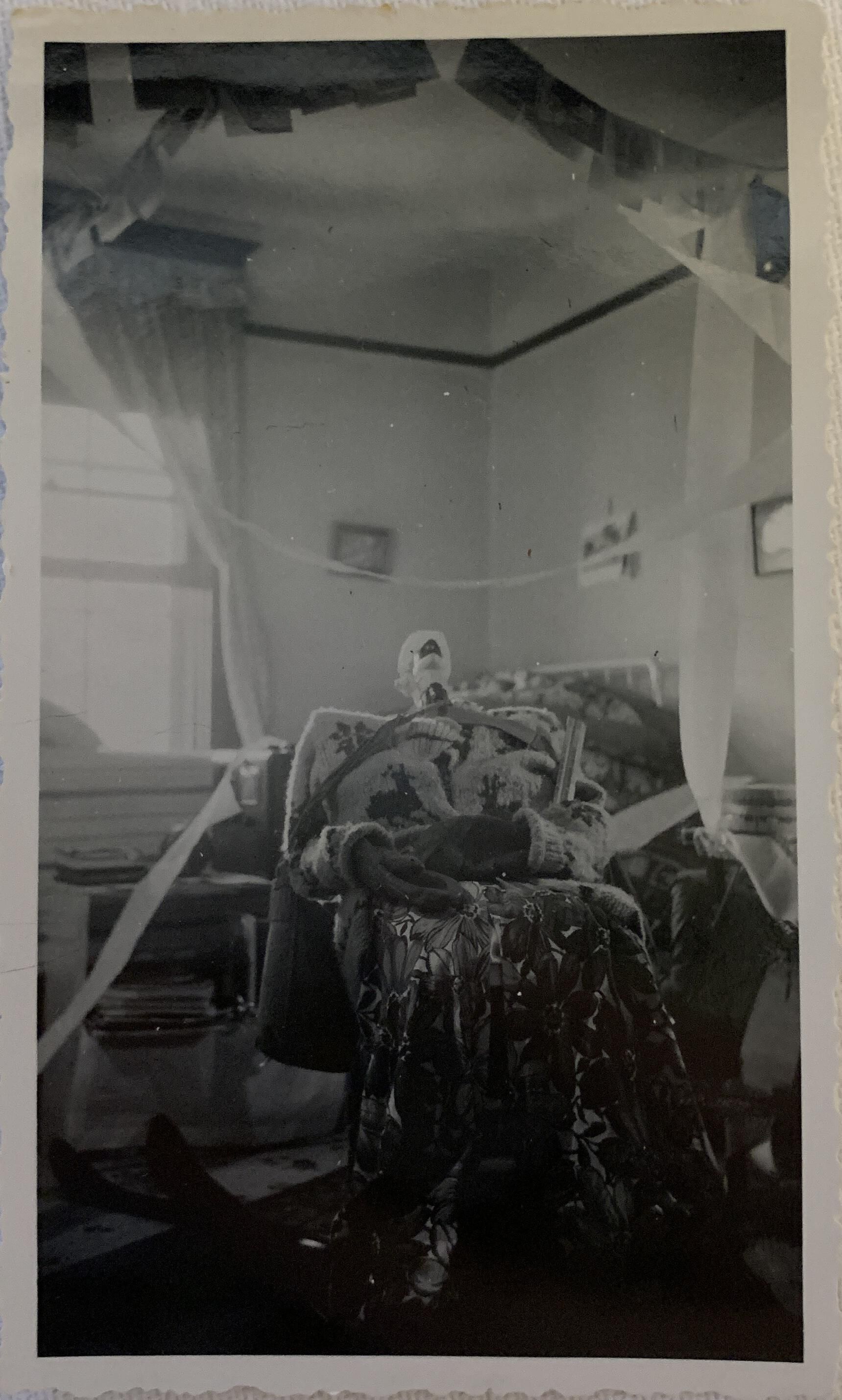 Rocking chair with an outfit on it. Cards strung across ceiling. Bedroom scene, Christmas Day. Hazelton 1944Photograph Details