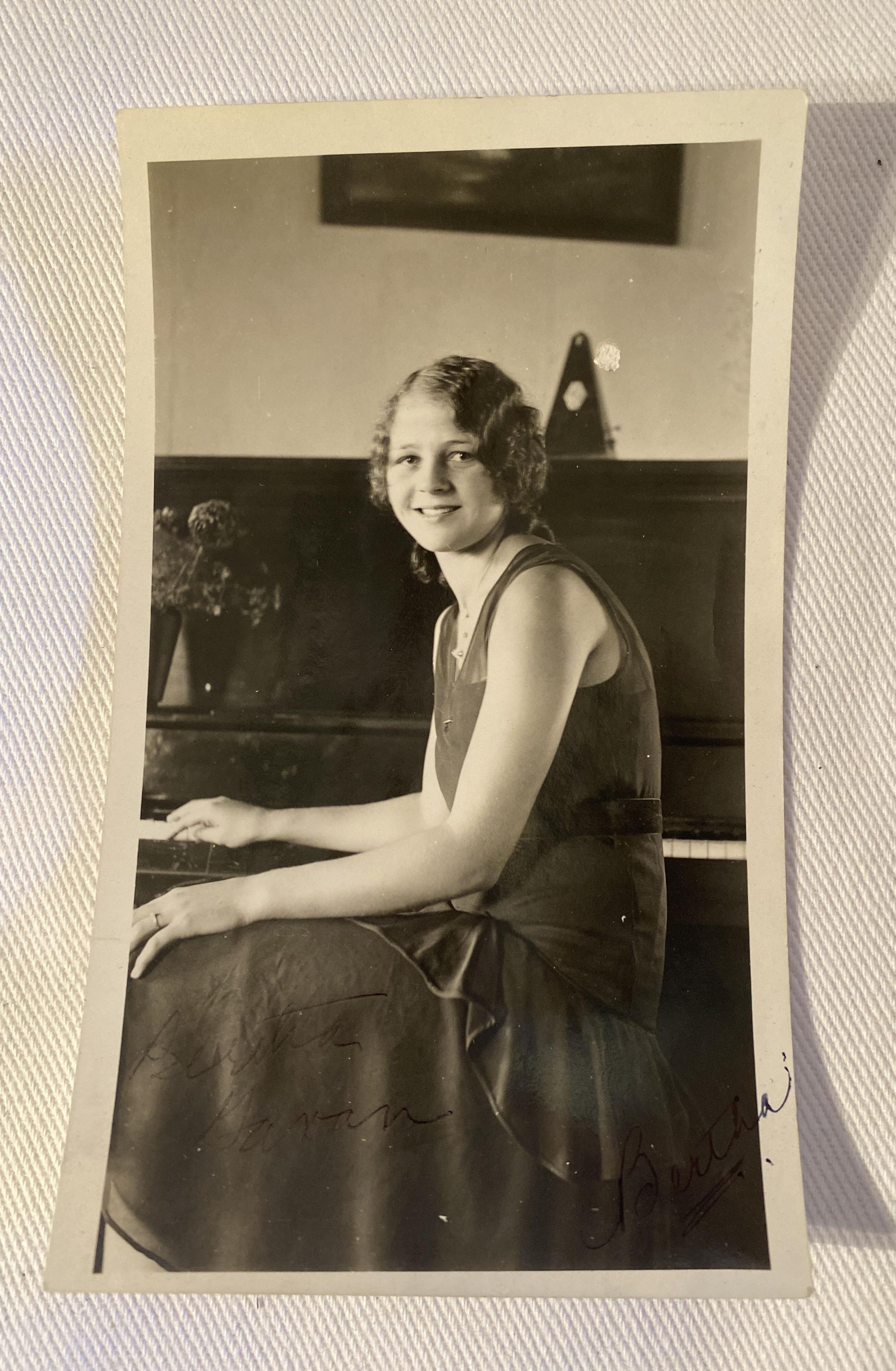 Black and white photograph of a woman sitting in front of a piano written on photo in ink is ‘Bertha Gavan’ ‘Bertha’Collection