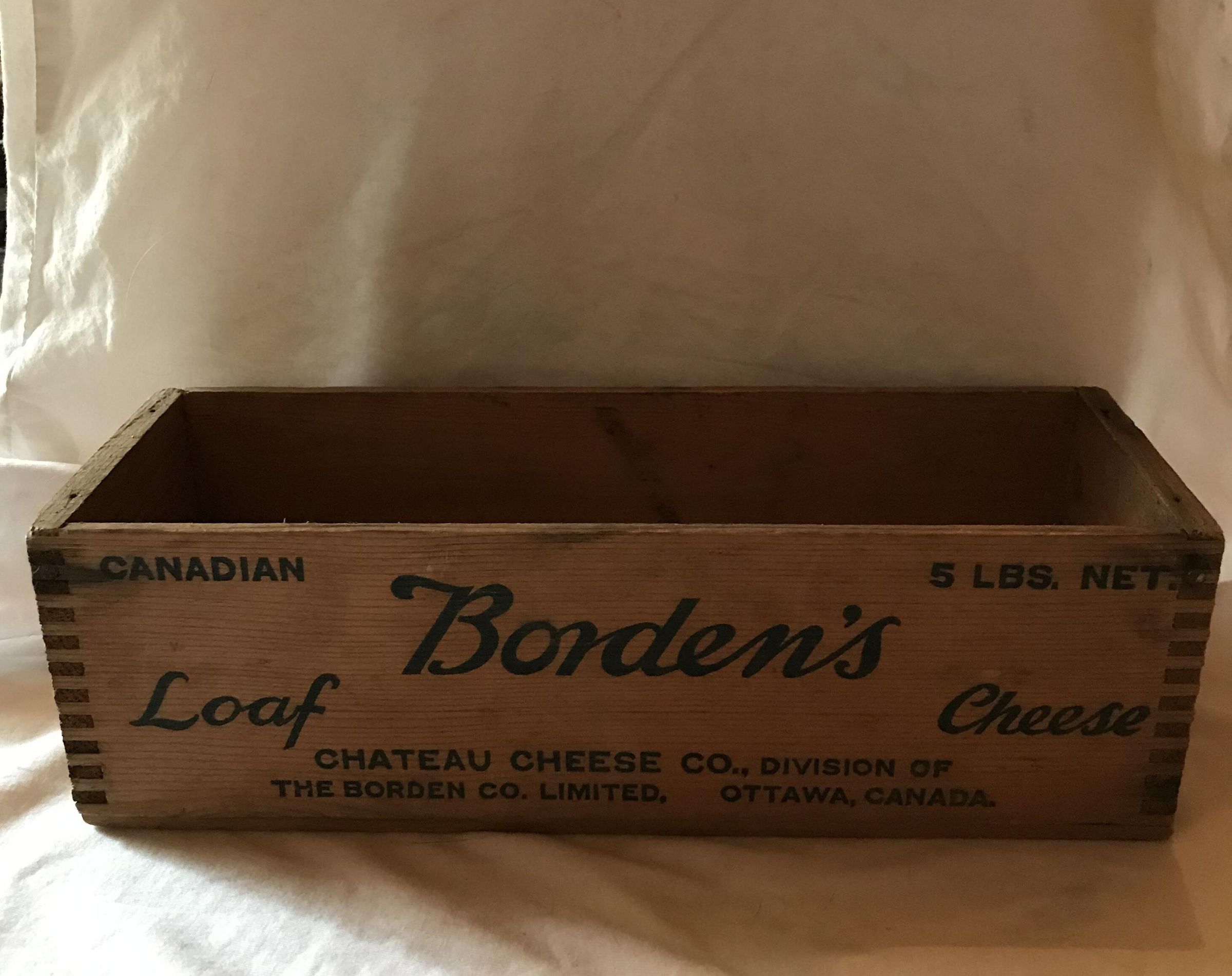 The front and back have the words " Canadian Borden's Cheese Loaf. 5 Lbs net. Chateau Cheese Co., Division of The Borden Co Limited. Ottawa Canada." printed in blue.