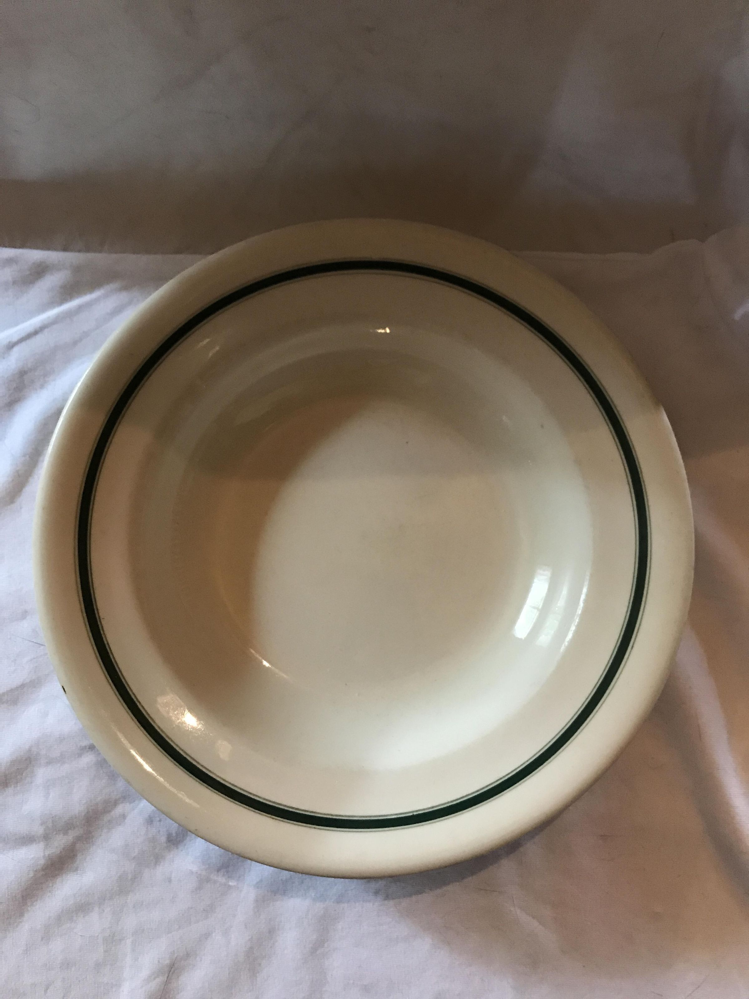 Large porcelain soup bowl with one green trim - bottom: Vitrified, Globe Pottery Co Ltd, Shelton, England, Buscombe & Co, Vancouver, Canada.Acquisition