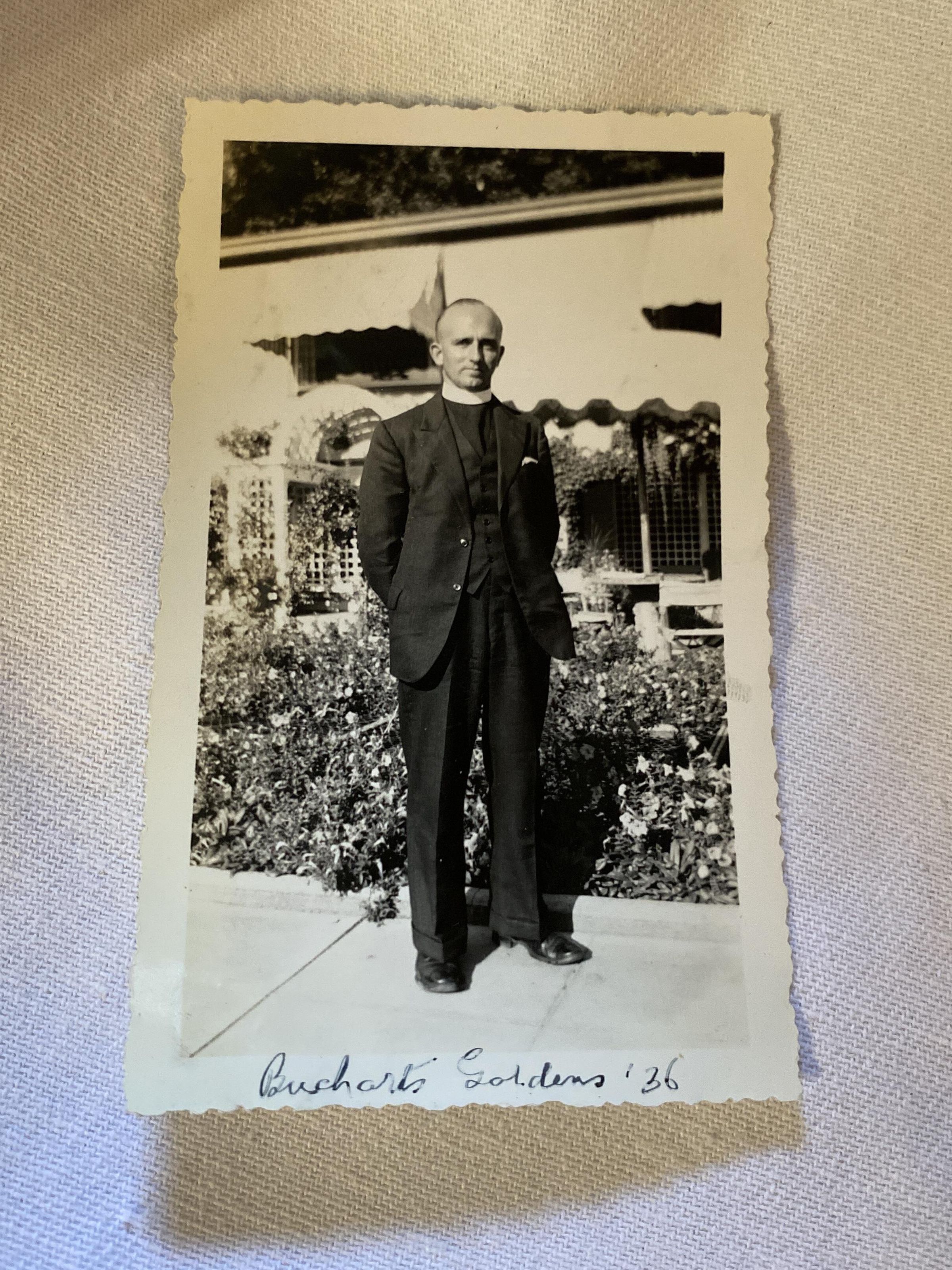Photo shows Minister standing in Buchart Gardens, 1936Photograph Details