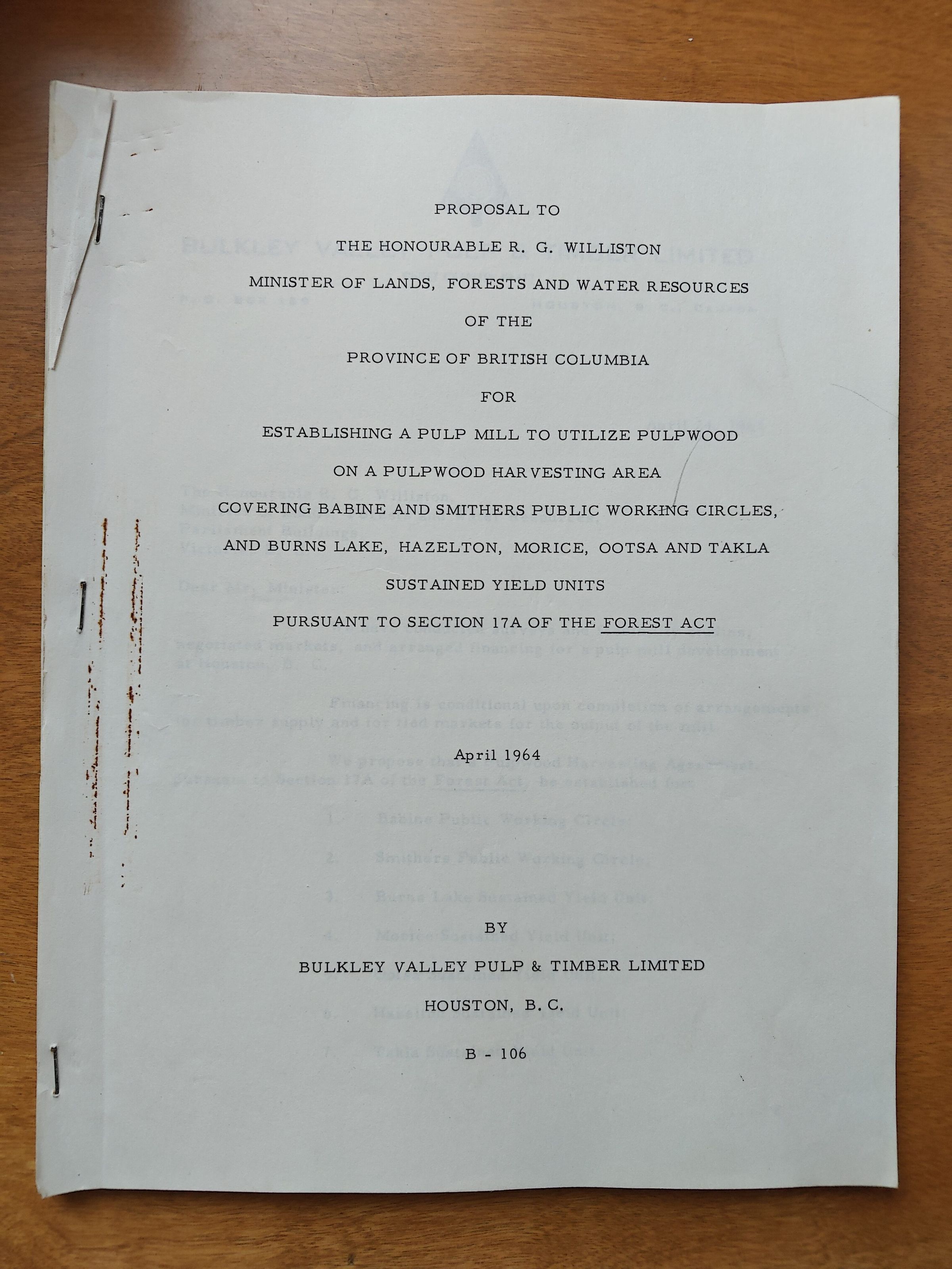 "Establishing a Pulp Mill to utilize Pulpwood on a Pulpwood harvesting area covering Babine and Smithers public working circles, and Burns Lake, Hazleton, Morice, Ootsa, and Takla."Subject Person/Organization