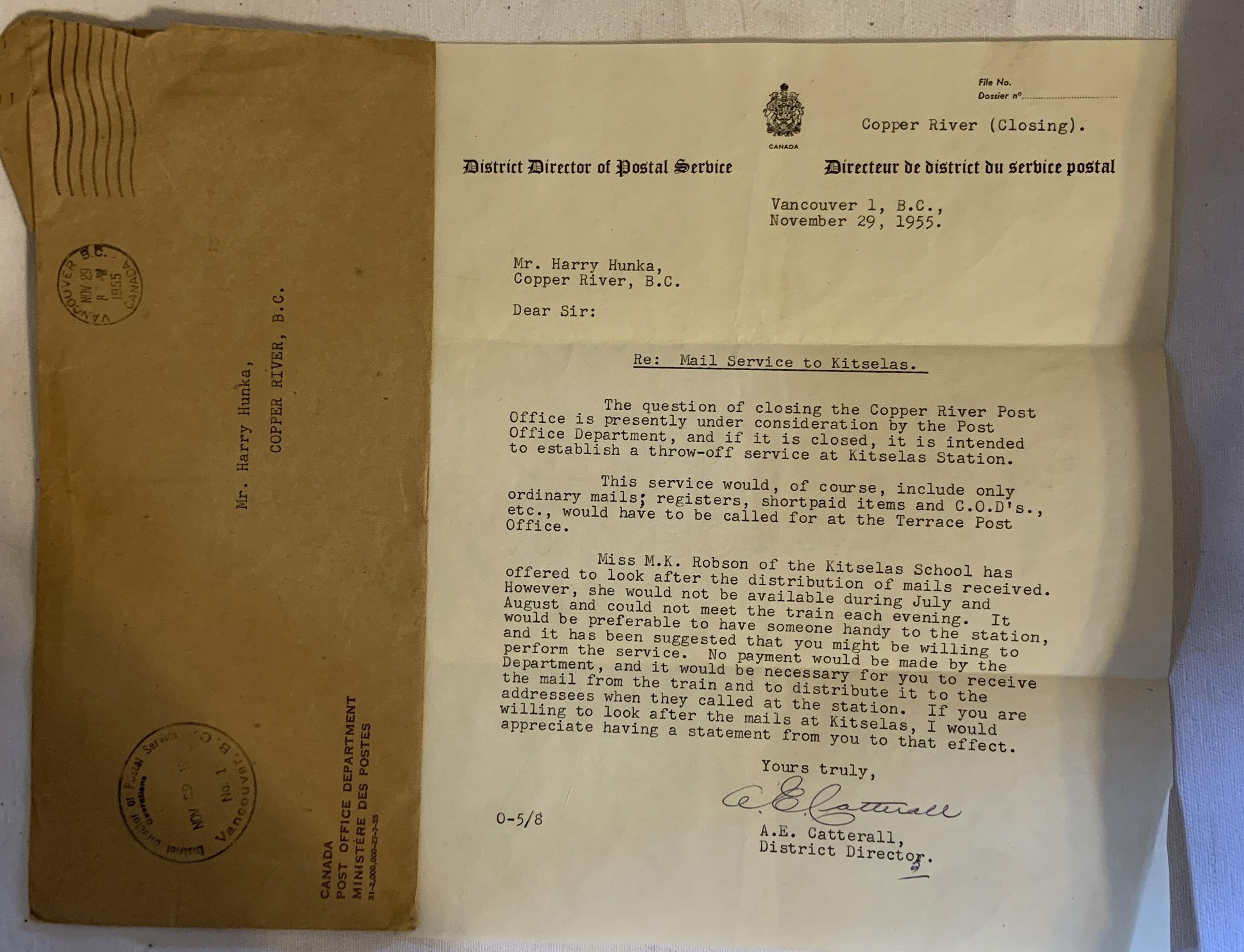 regarding closing copper river post office and having Harry distribute mail at KitselasAcquisition