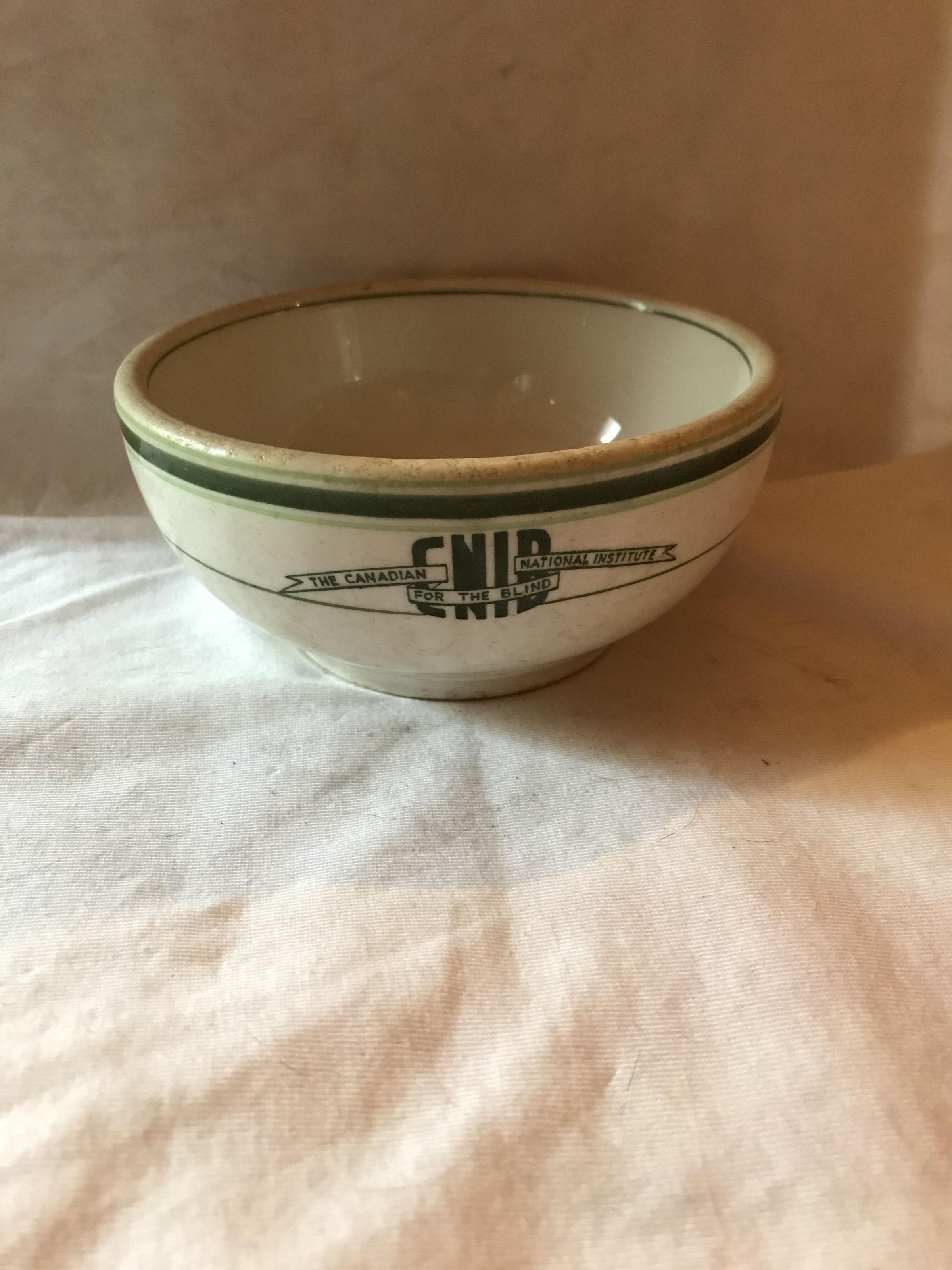 Small porcelain cereal bowl with light green and dark green trim with CNIB, the Canadian National Institute for the Blind on the side. Bottom: Duraline.Acquisition