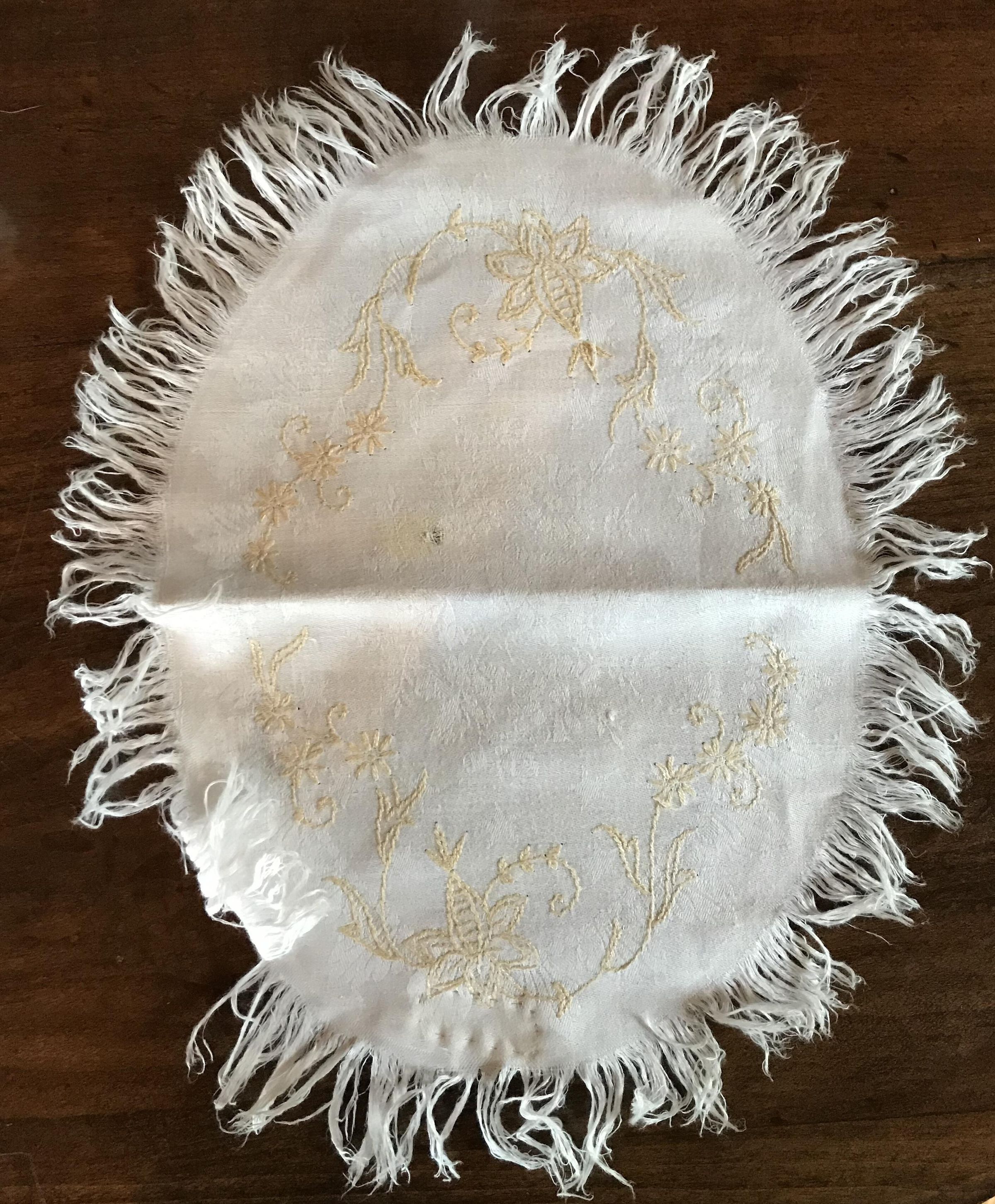 Small oval tray cloth hand embroidered, fringed and very oldUse