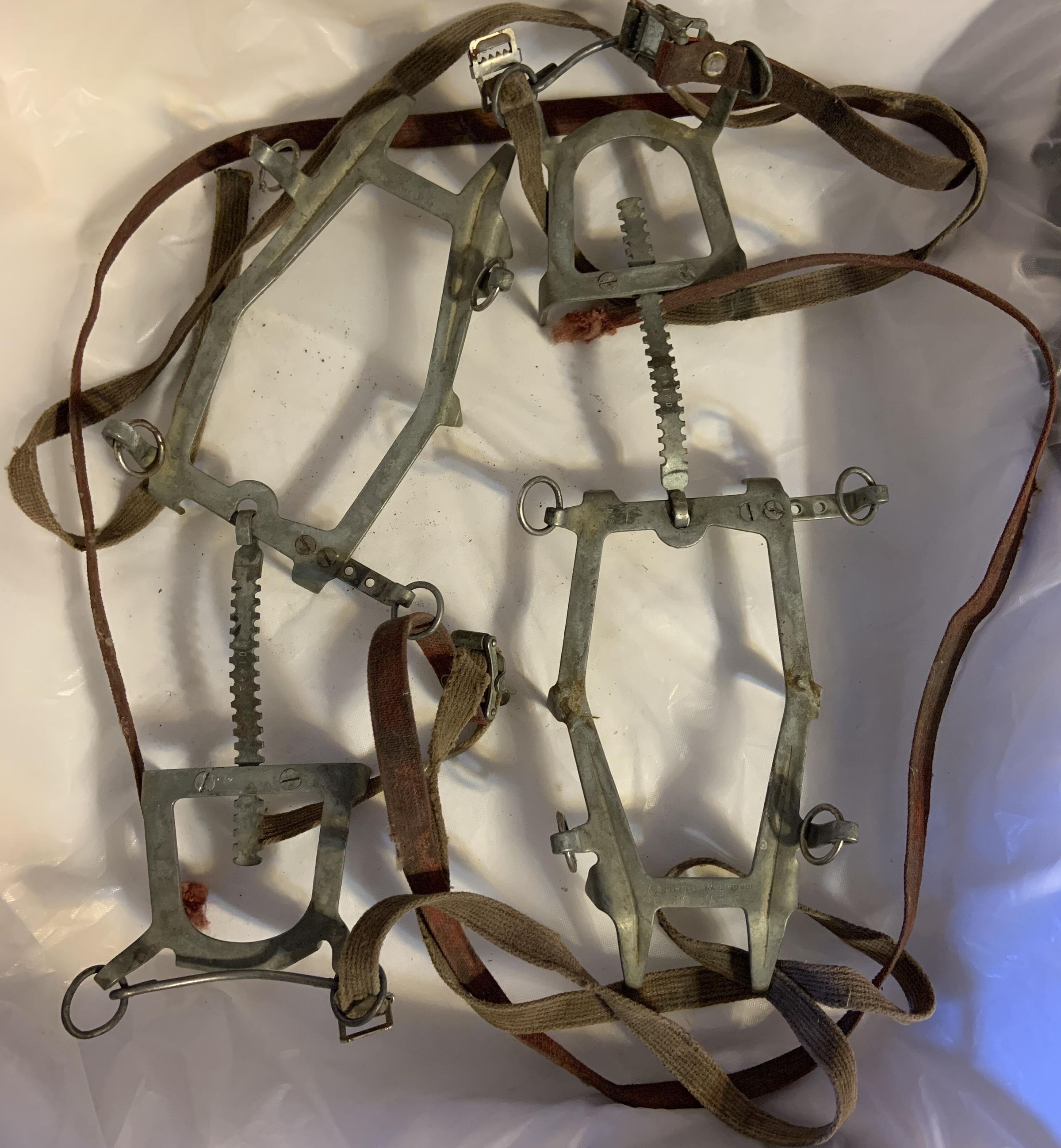 Two part (toe and heel) cleats connected by adjustable centre strap.
