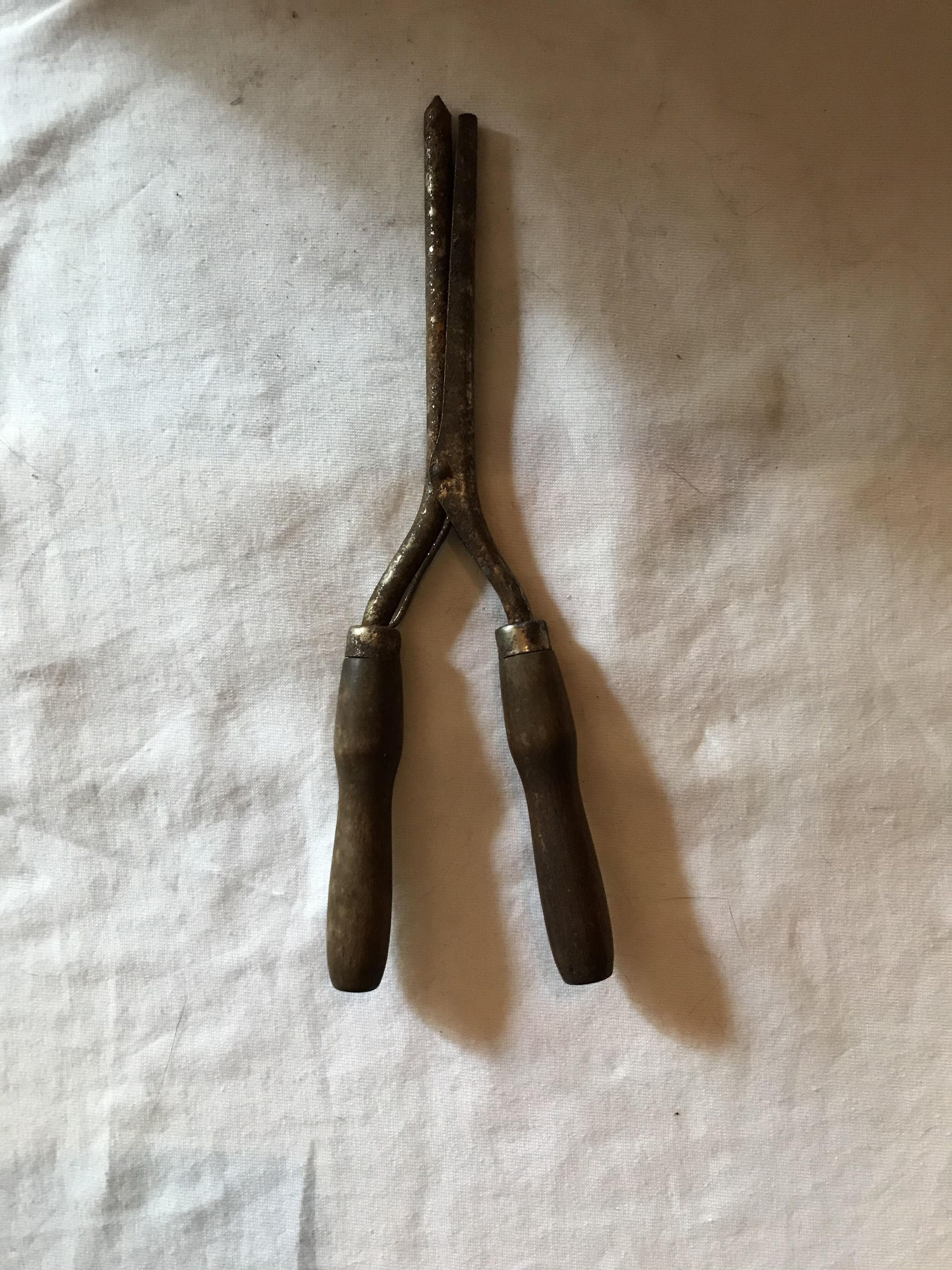 The curling iron is not in good condition. The curling part is made from iron. There are two wooden handles. One handle holds the outside of the curling apparatus. The second handle holds the inner part of the curling apparatus. There is a spring in the middle of the two handles to open the curling iron to place the hair in the middle.Acquisition