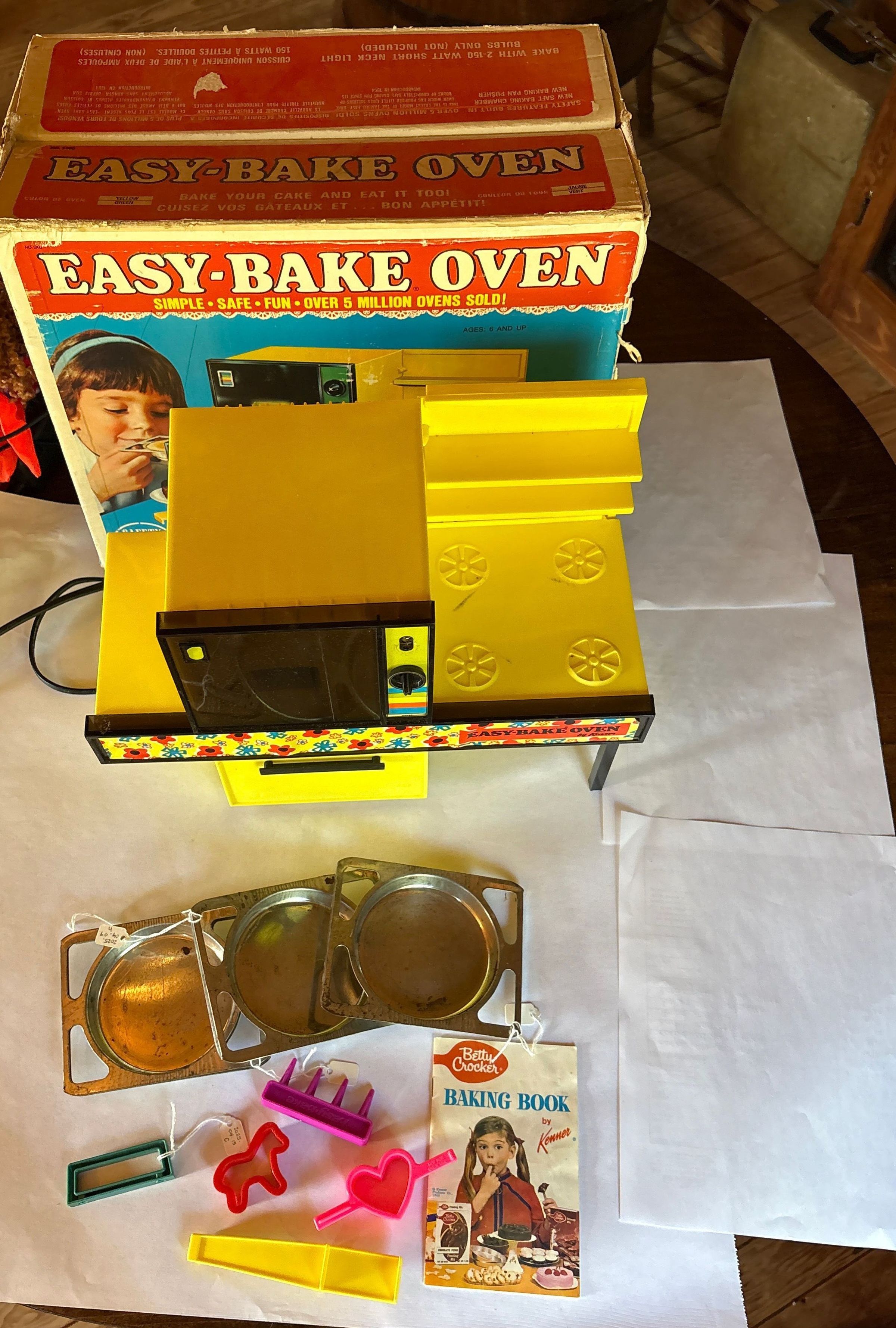 Easy bake oven’s were started in 1963 by Kenner Products. This model is from 1971 and was one of the first models. This one comes with some accessories and a Betty Crocker baking book.Context