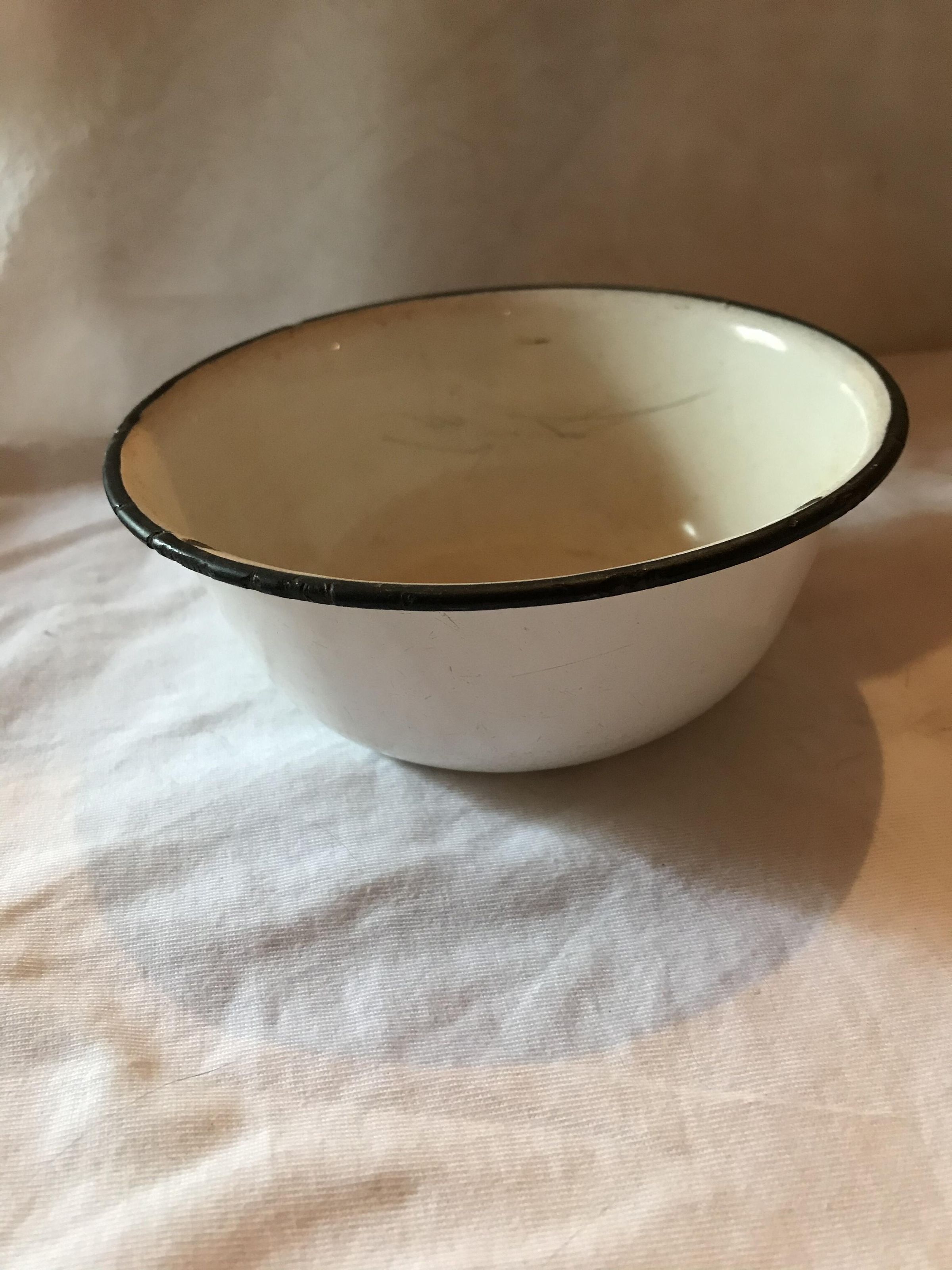 Small white enamel/black trim bowl. No Markings.Acquisition