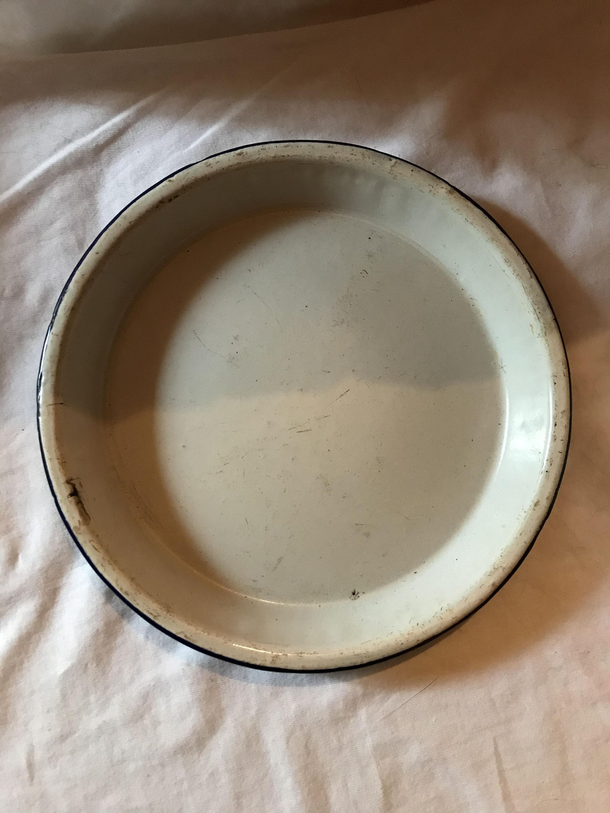 Plate/bowl. White enamel with blue trim. Unreadable pinkish writing on bottom.Acquisition