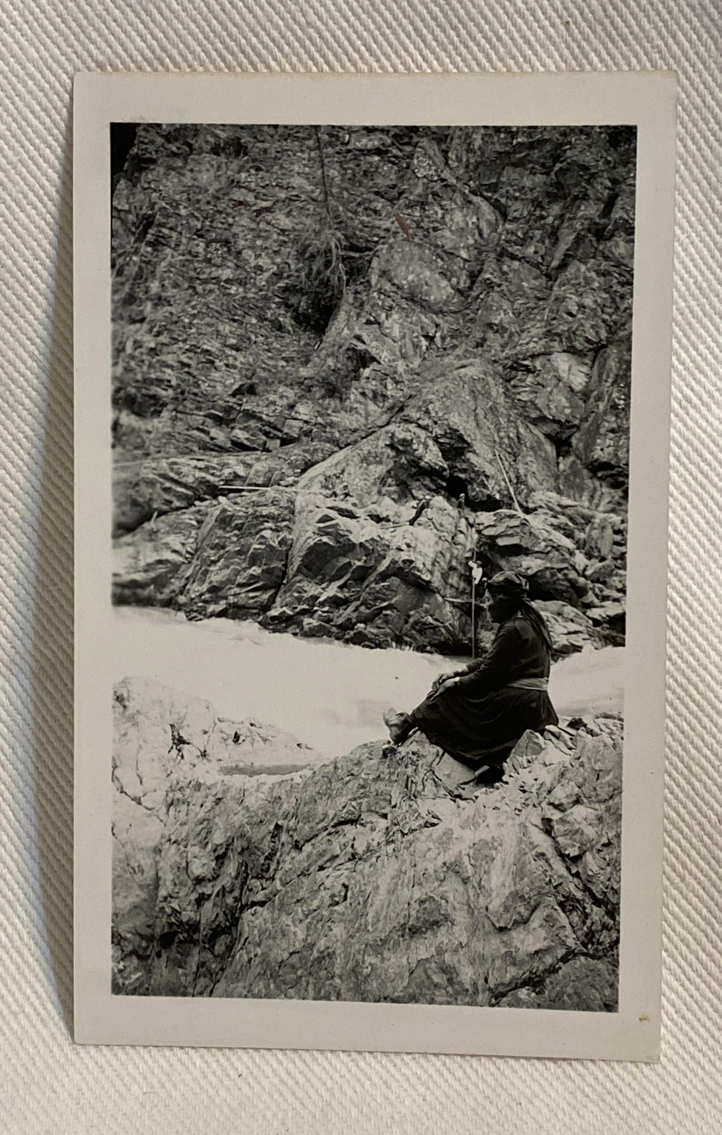 Grandma. Fishers across the river. This picture gives an idea of the size of Hagwilget Canyon in June of 1943Photograph Details
