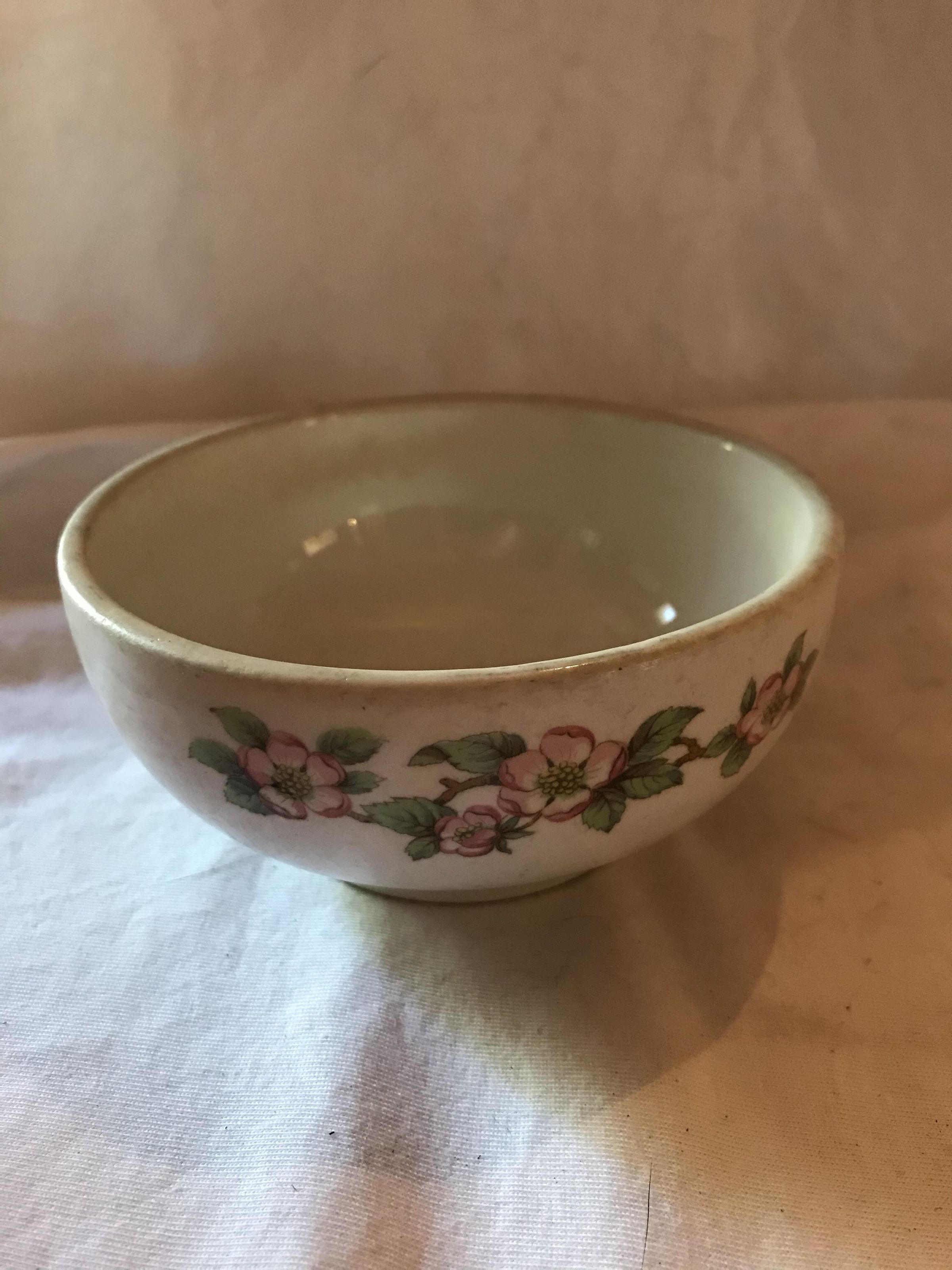 Bowl or dish with pink apple blossoms made by The Gindley Hotel Ware Co LtdAcquisition