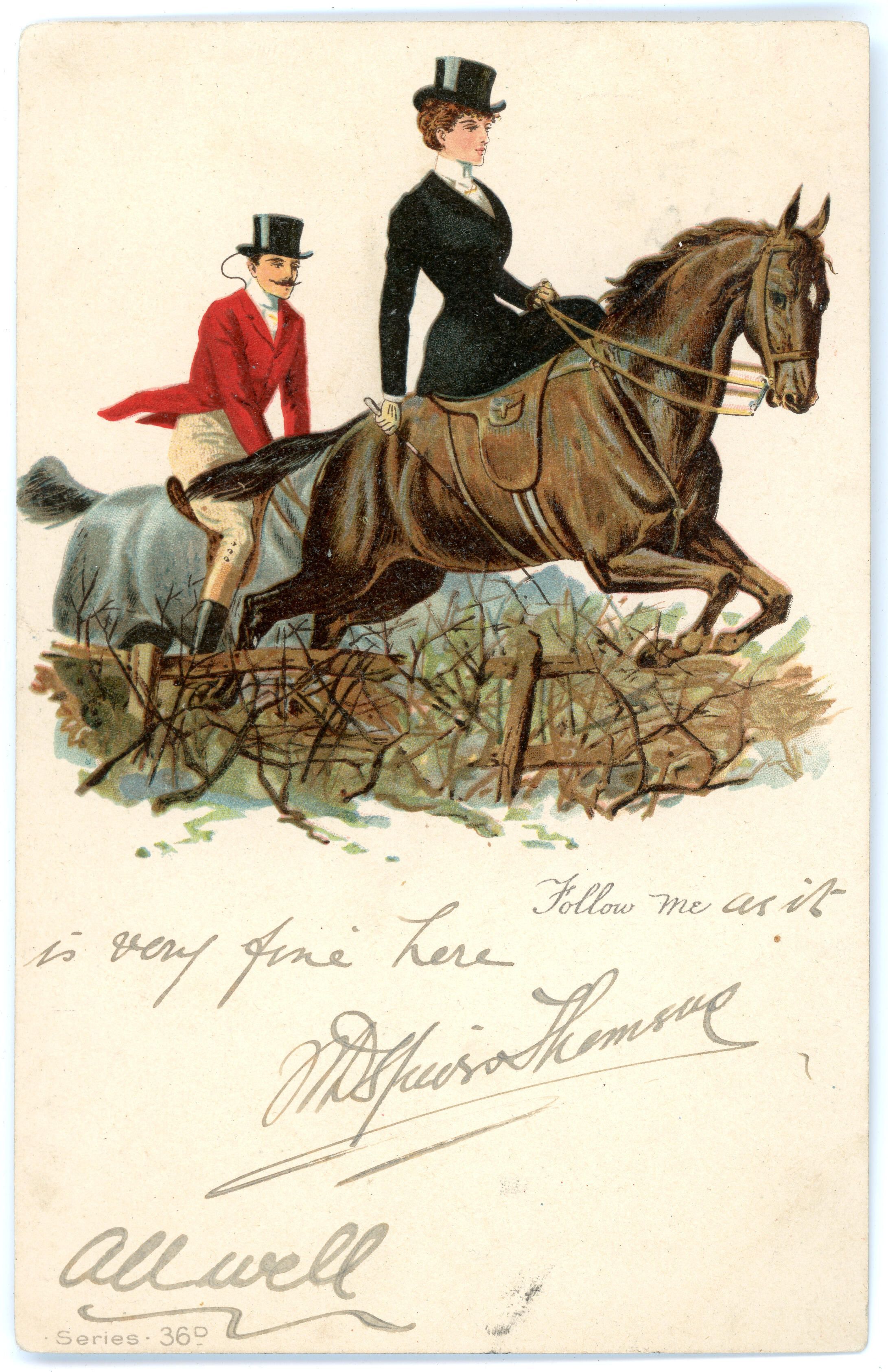 Image is of a man and woman riding horses, woman is side saddleCollection