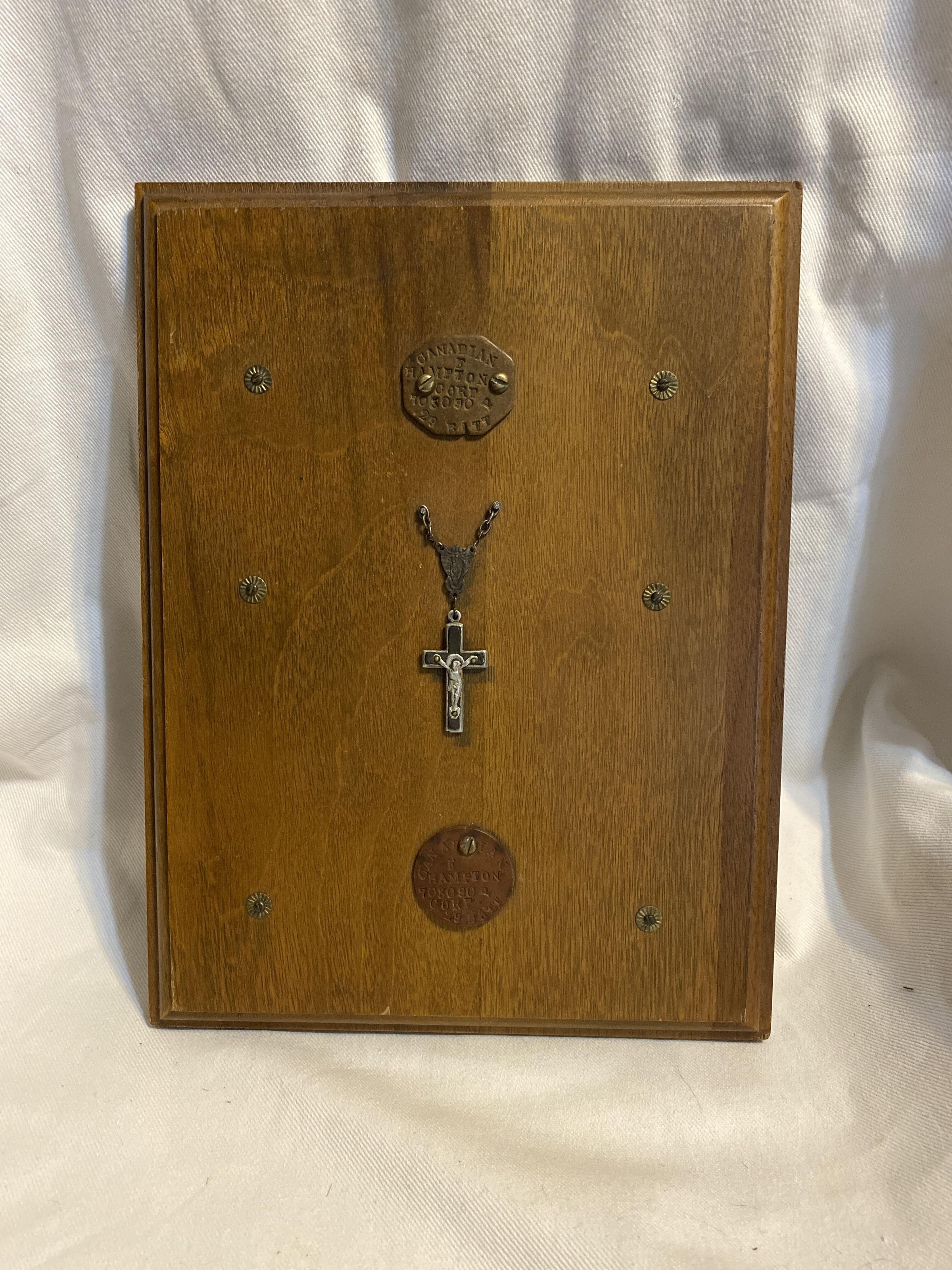 Plaque of Fred Hamptons dog tags and rosaryAcquisition