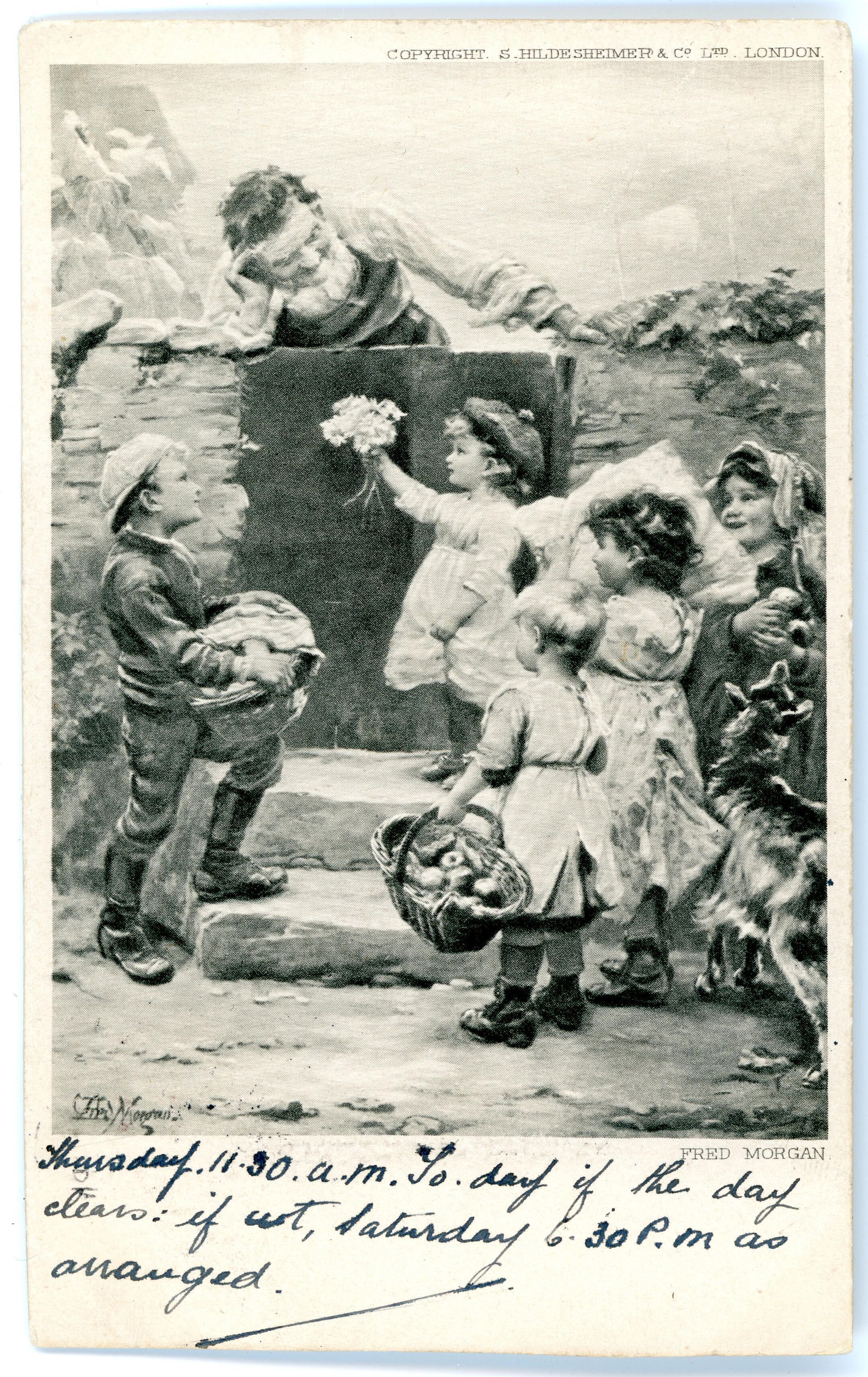 Postcard from 1903 of 5 children offering different things to a lady from across a fence, some of the things they are offering are flowers and fruitCollection