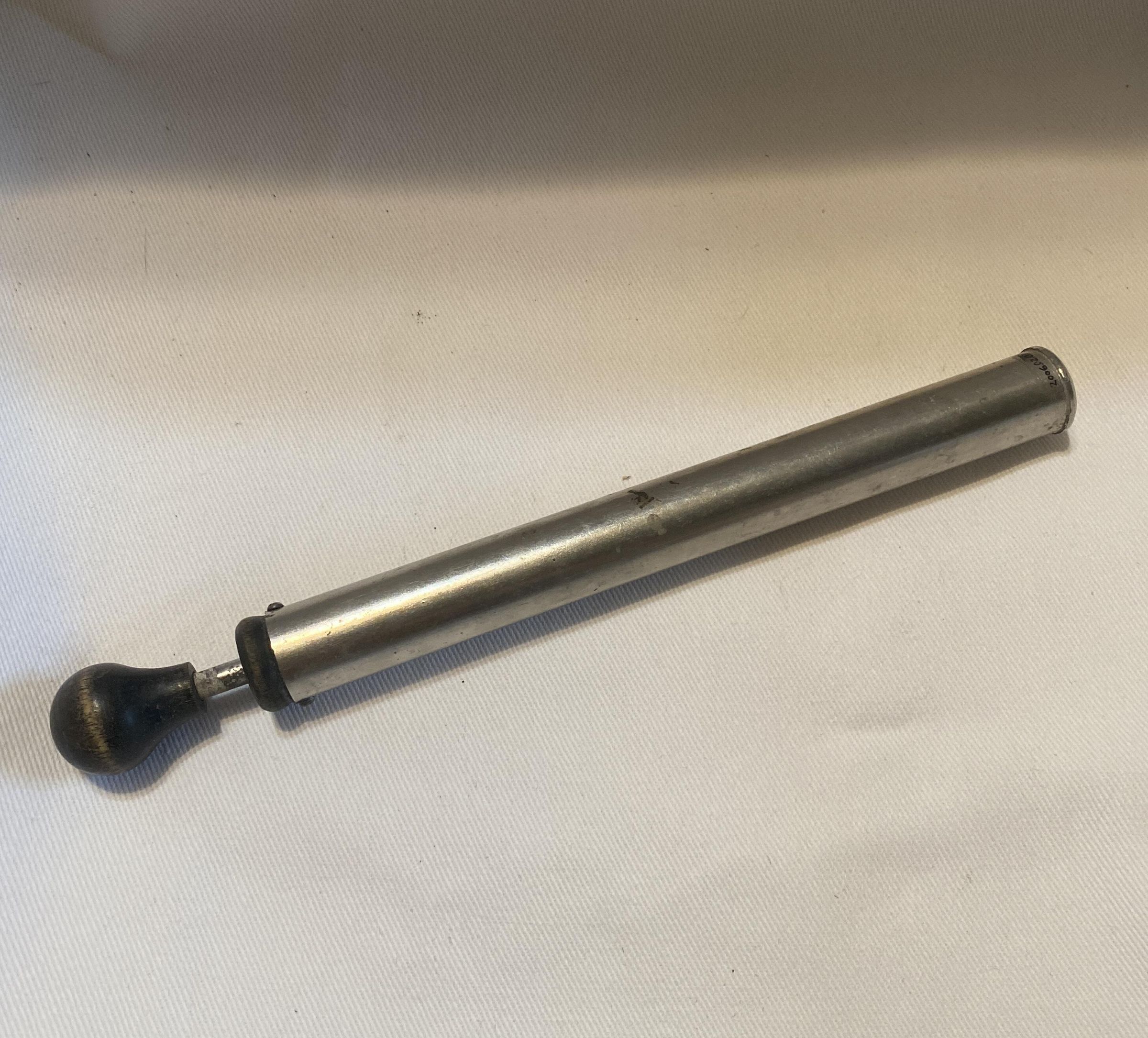 silver cylinder containing a rod that pumps in and out. Wooden handle attatched to rod.