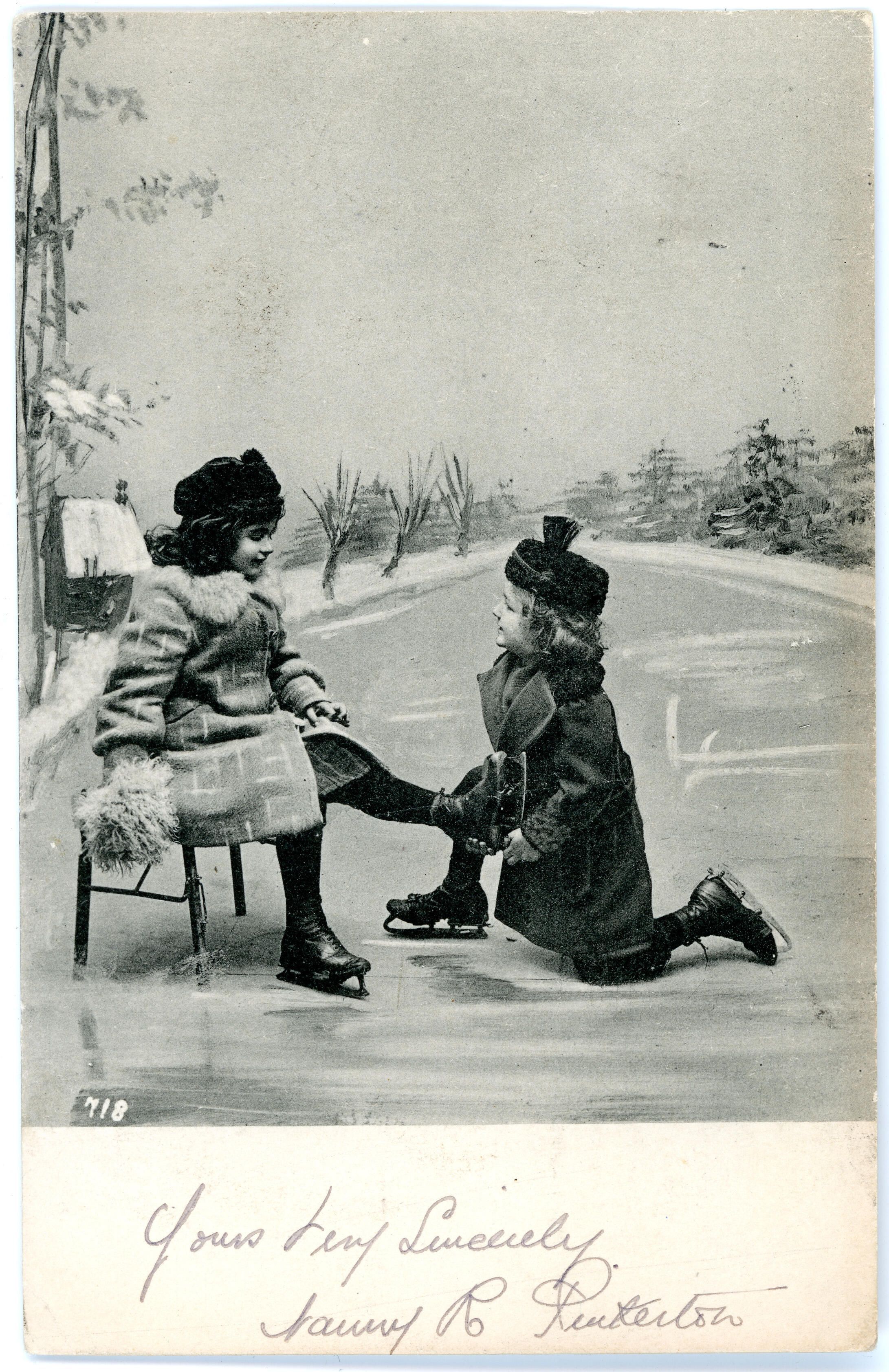 Postcard from 1904 of two young girls about to go skating, one is helping the other tie her skates.Collection
