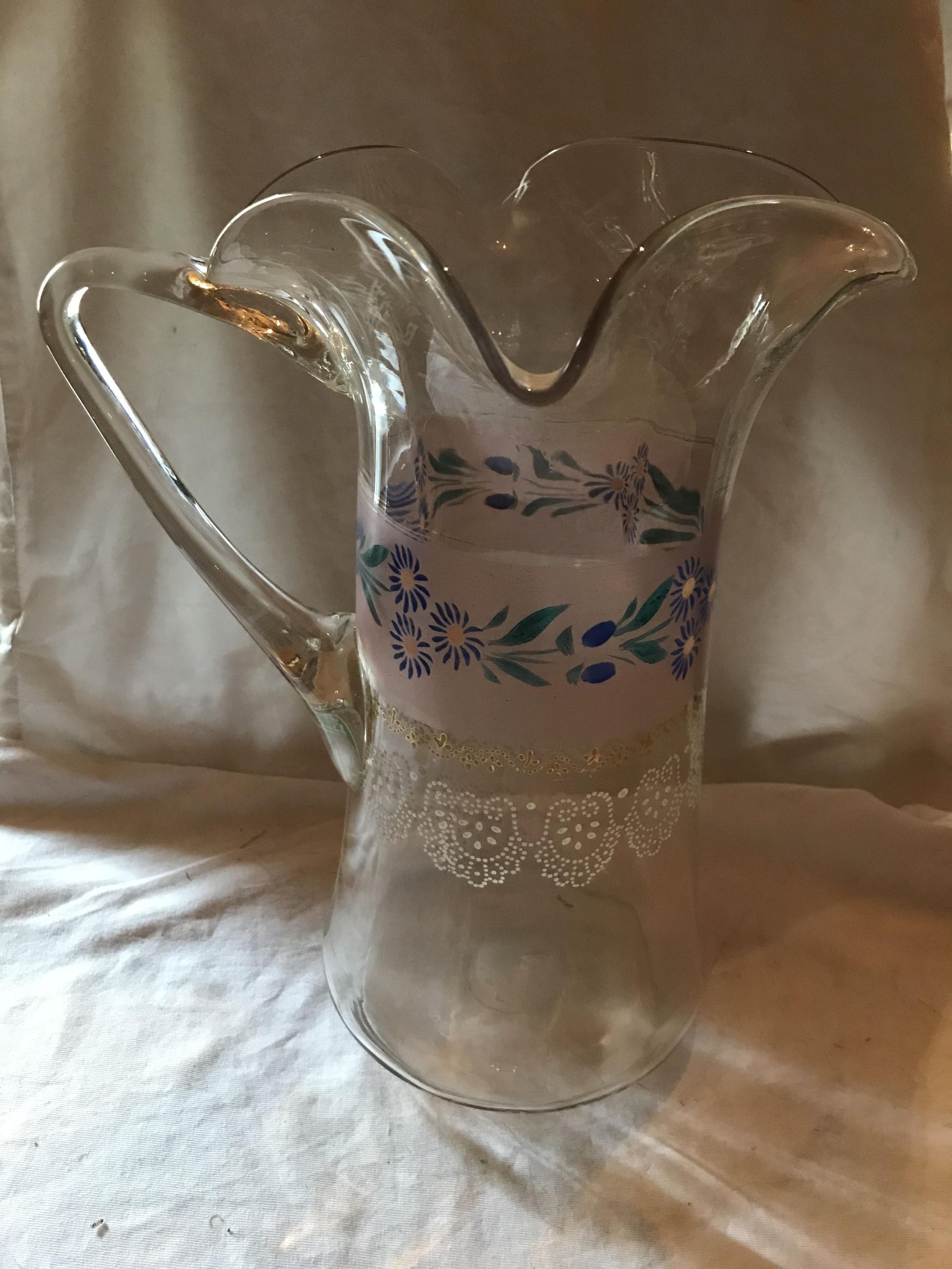 One glass pitcher - clear glass with floral patterns.Use