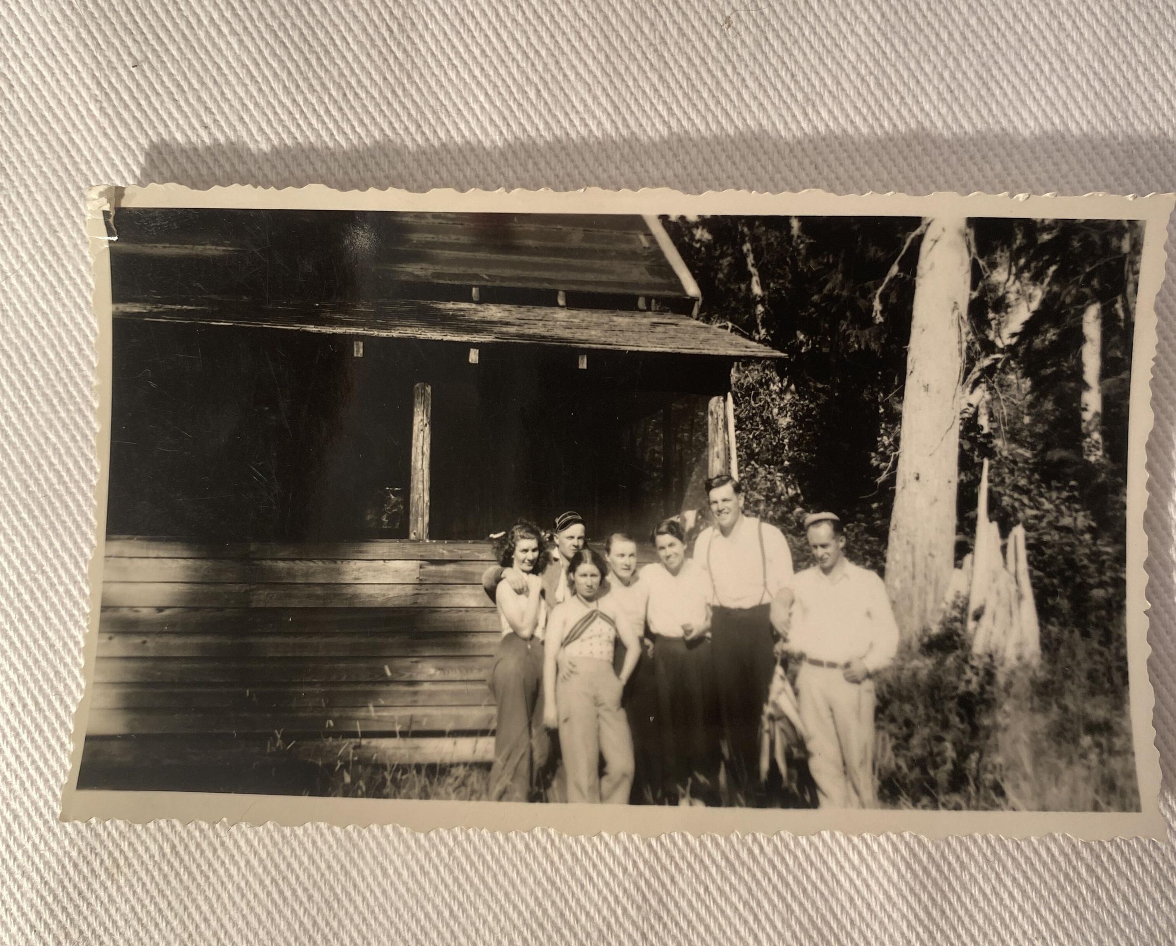 Black and white photograph of a group of people. In front of potentially the Little's Cabin
