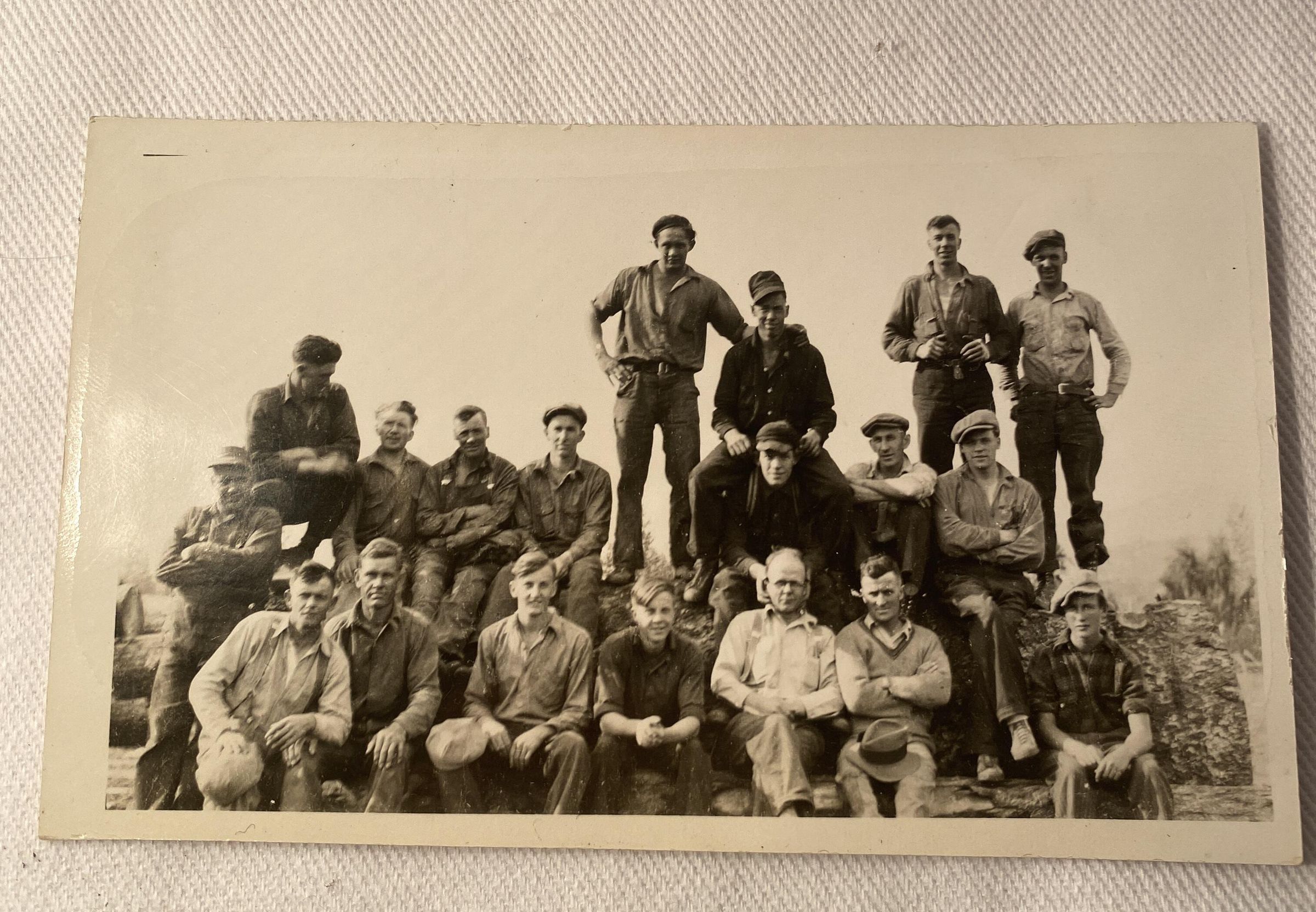 Black and white photograph of a group of men sitting on top of fallen logs.Photograph Details