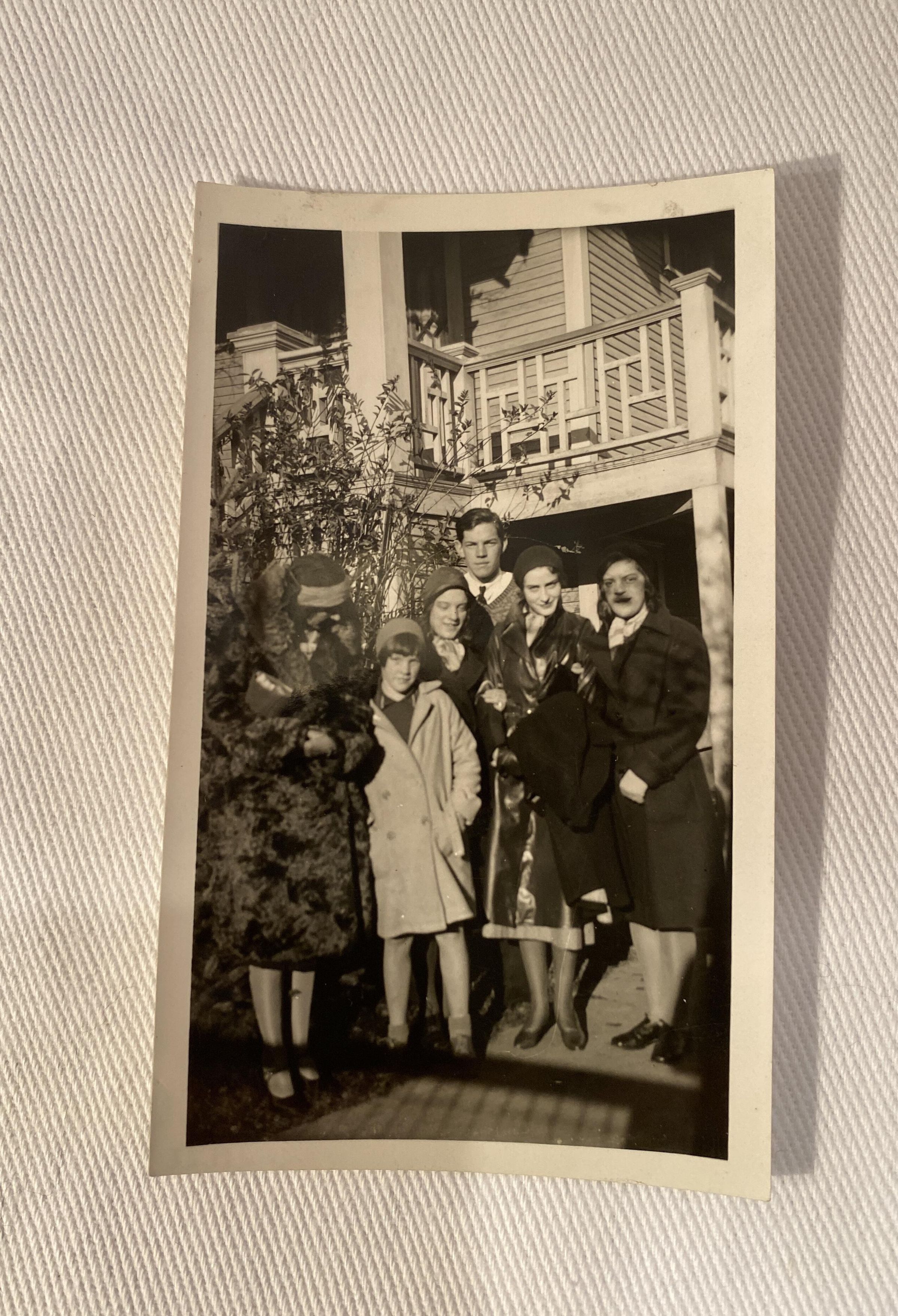 Black and white photograph of a 5 women and a man standing in front of a house, potentially Little houseCollection