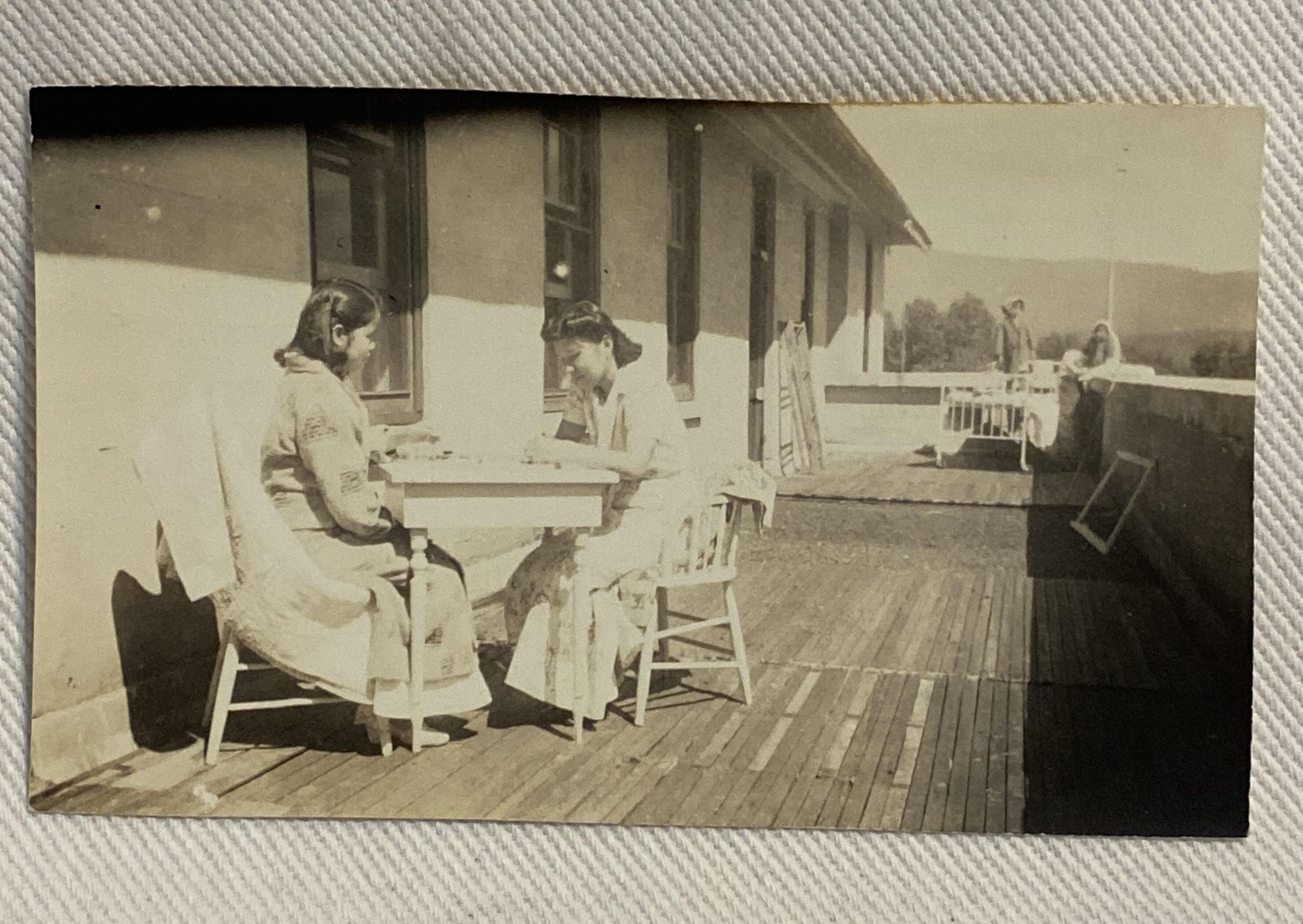 Hannah & Eliza sitting at a table outside Wrinch Memorial Hospital. August 1943Photograph Details
