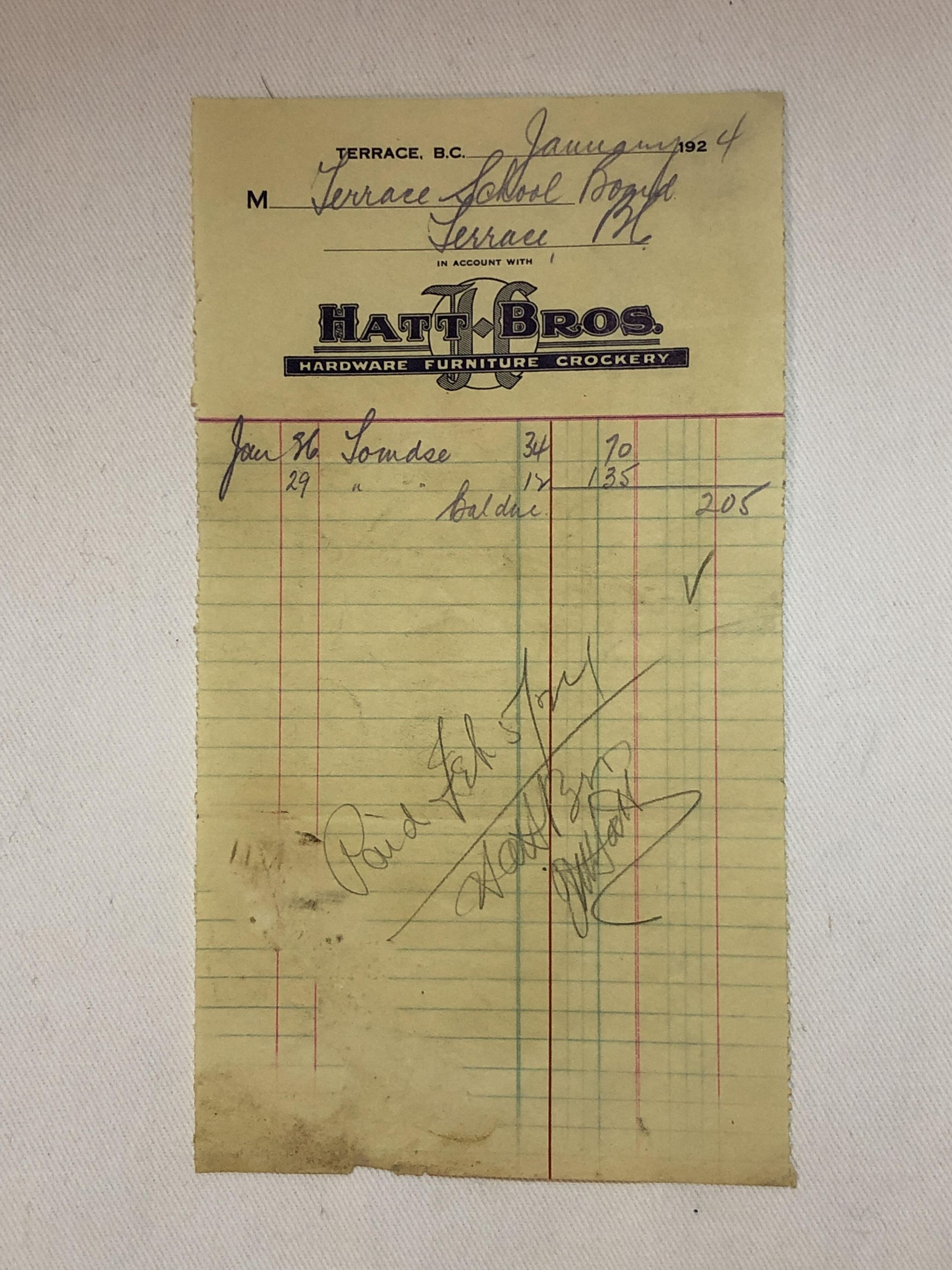 'Hatt Bros January 1924' ReceiptEntry/Object ID