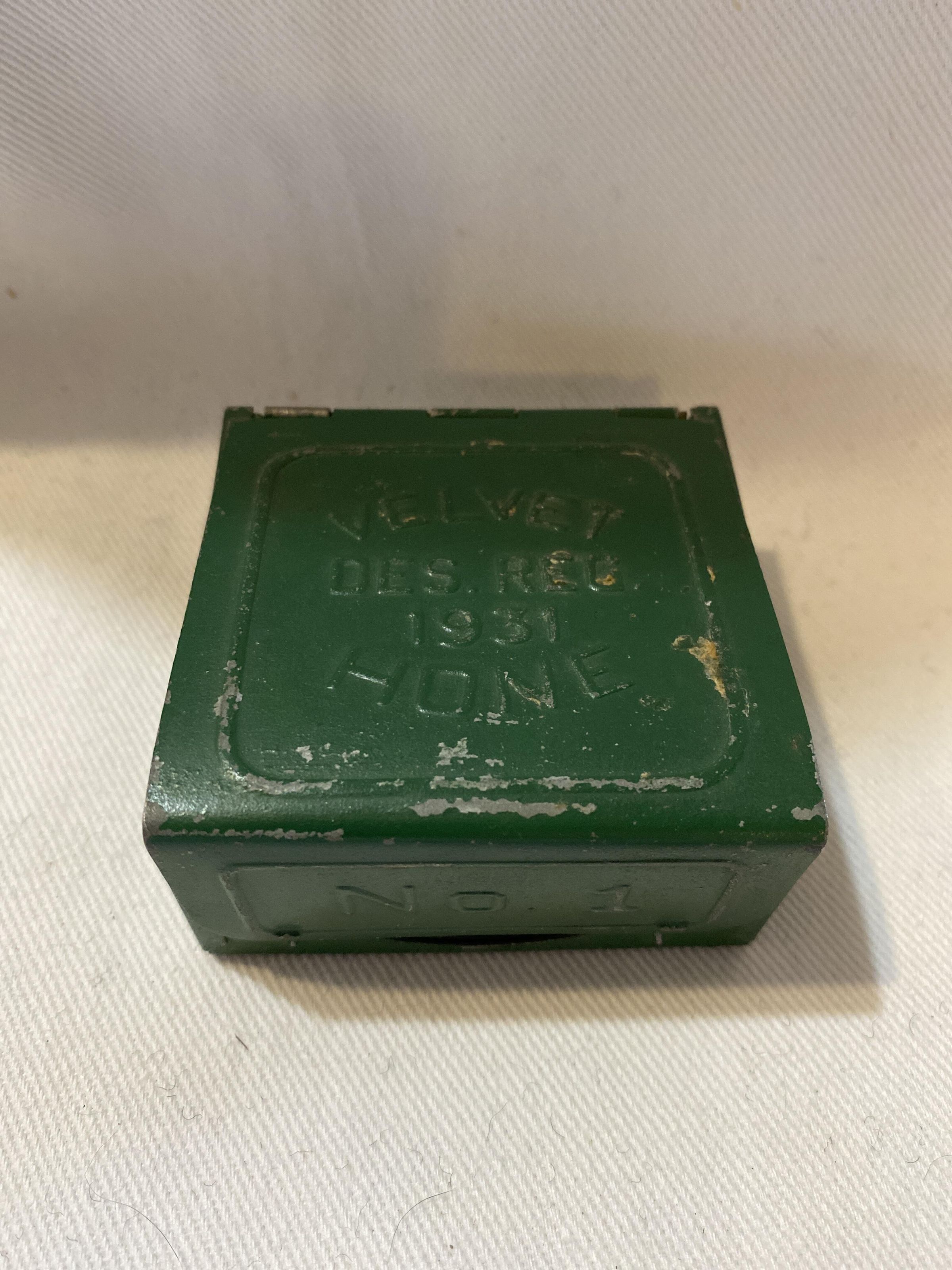Small green metal box razor blade sharpener. Velvet Des Reg 1931 Hone.Acquisition