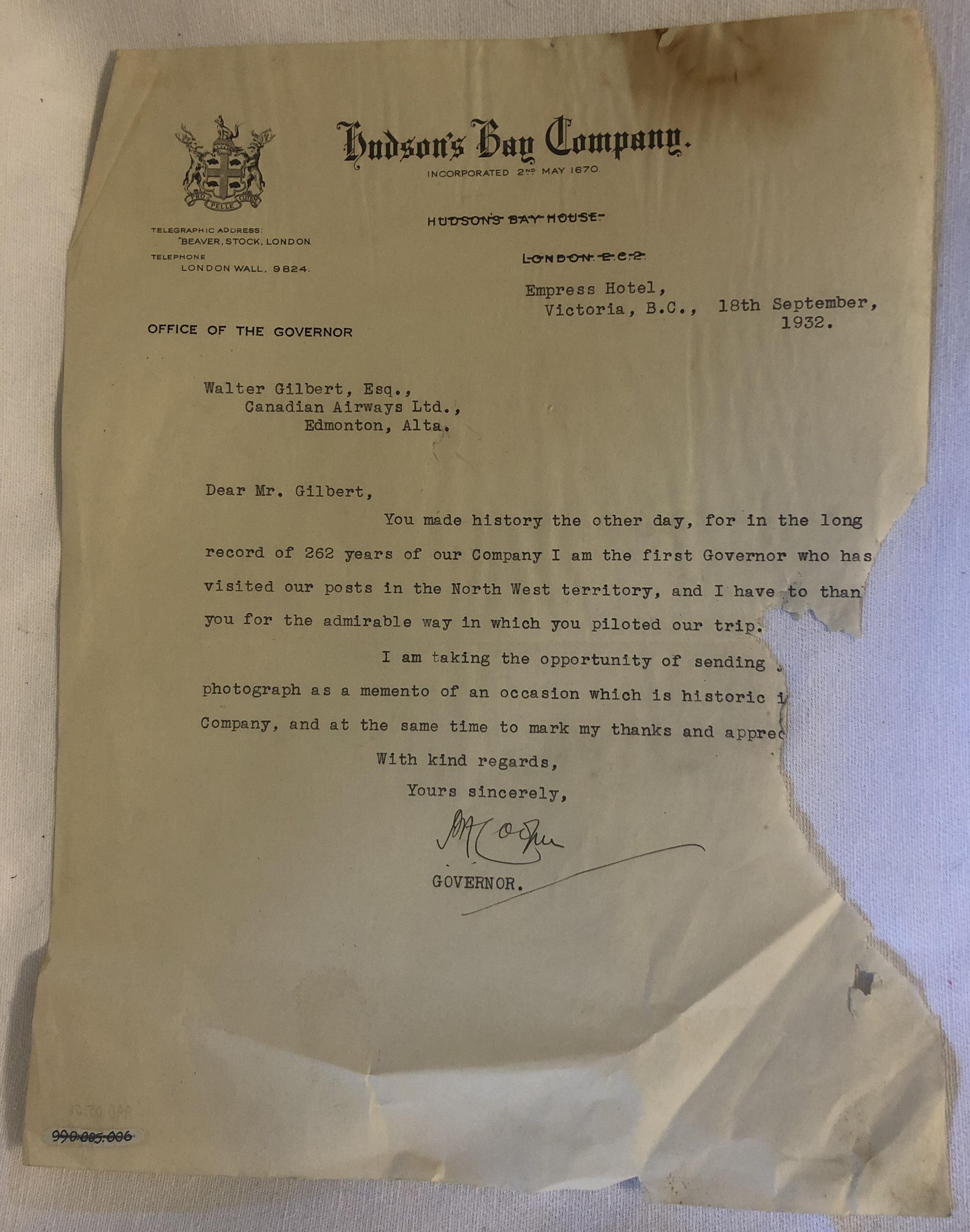 Hudson's Bay Company to Walter Gilbert the Governor of Hudson's Bay Company.Context