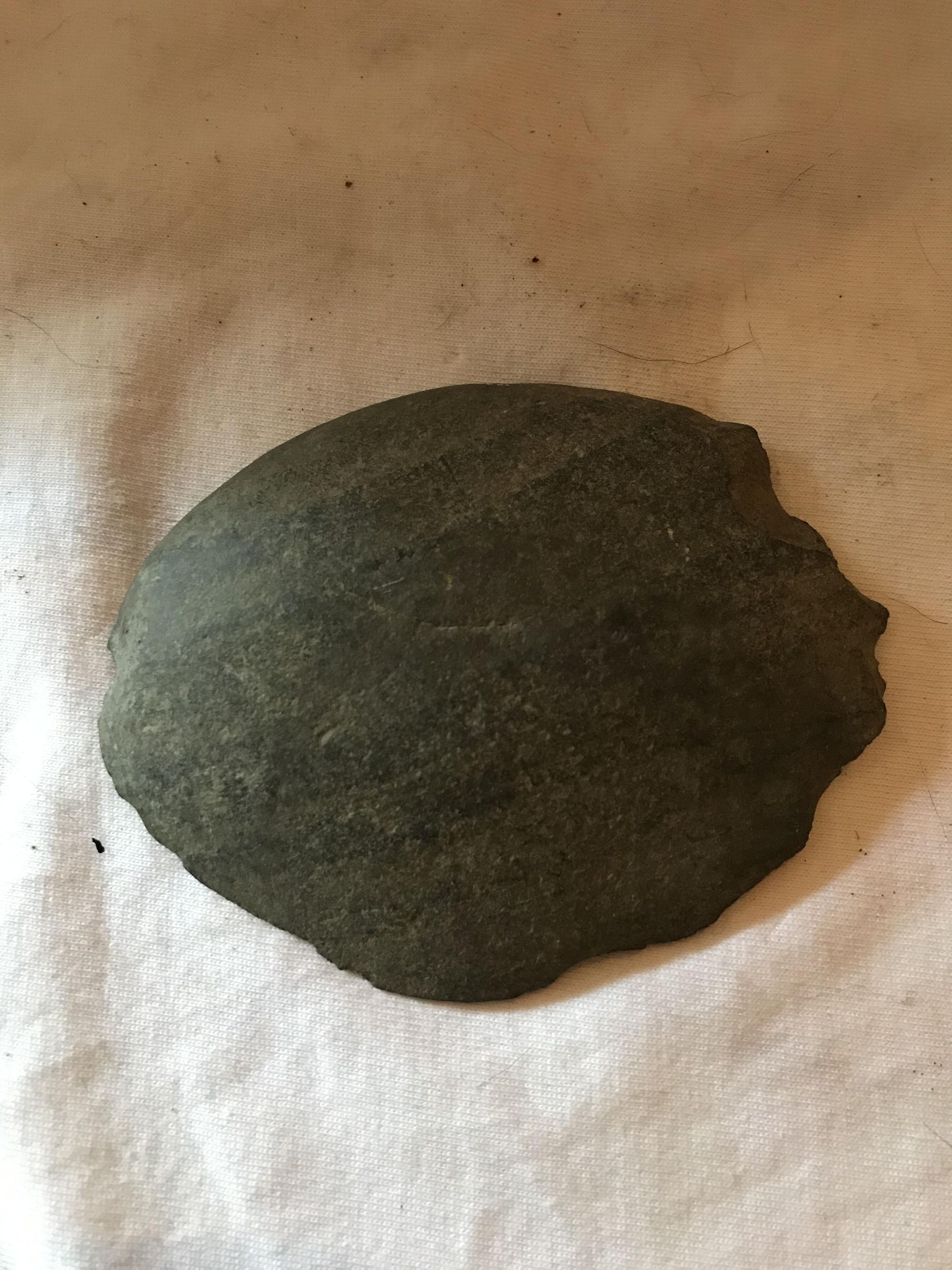 banded. form says ' stone scraper' it is not. although it has a bulb of percussion and a chip off from striking platform it could have broken through natural processes and since it is not flaked it has not been modified other than the potential first strike and is therefore of no archaeological interest. due to covenant we must keep it. It will be in front gardenAcquisition