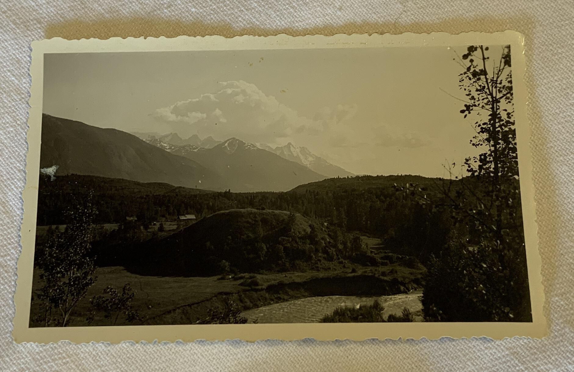 From road to Kitwancool looking across to Kitwanga and Skeena River Valley. Seven Sisters in background. June 1944Acquisition