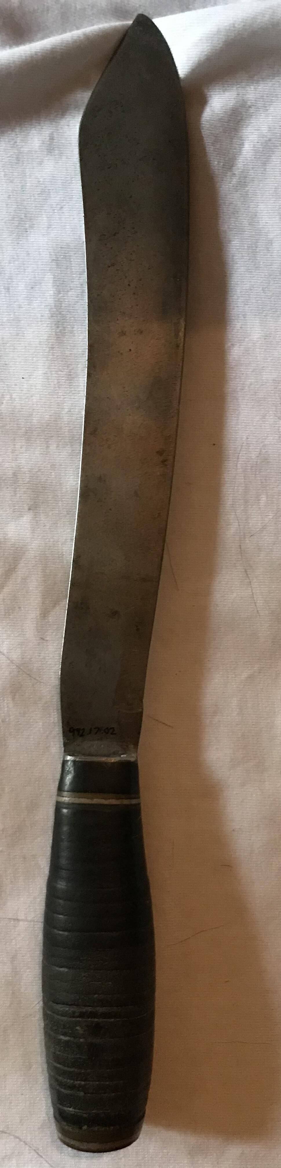 Home made knife made by a trapper who lived in the bush for Reginald John Sandover- Sly about 1900. Blade is made from an old saw blade. Real coins are used at Base of knife. Leather handle. RJ Sandover- Sly came from England in 1892. He was an engineer and did surveying in early ontario.Acquisition