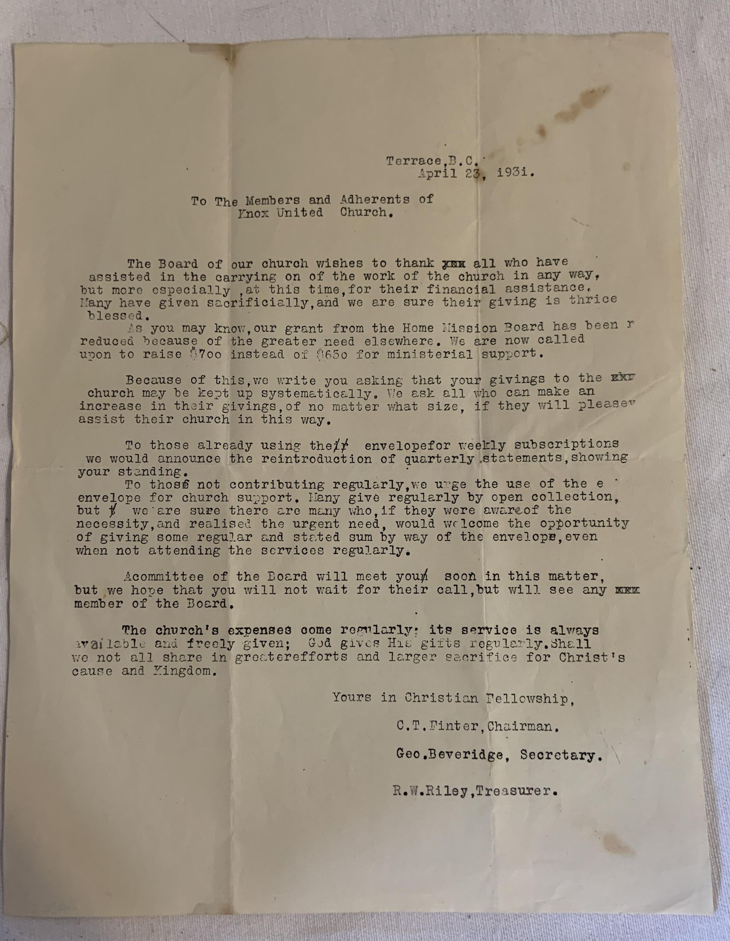 Knox United Church Letter 1931Entry/Object ID