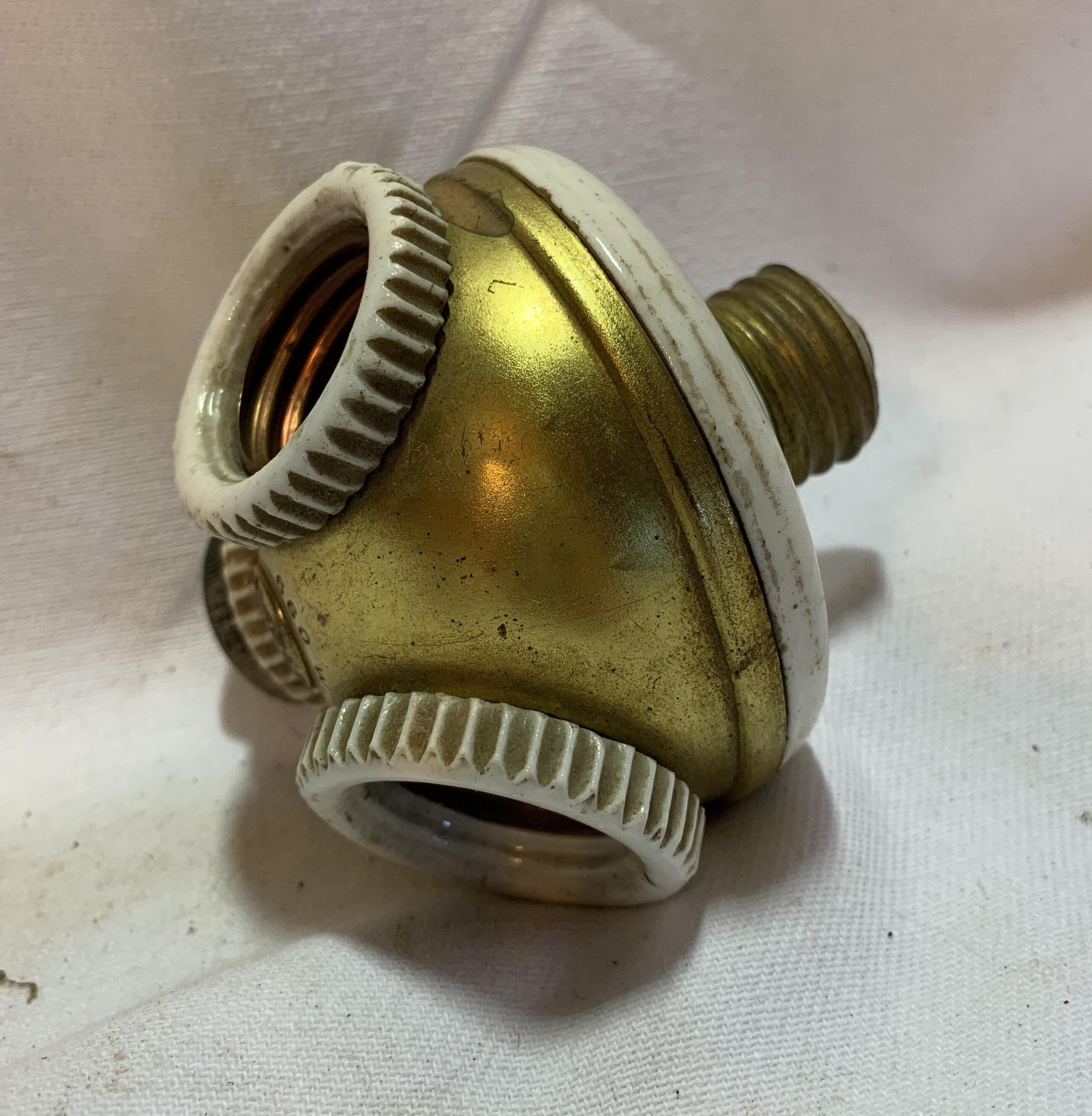 porcelain and copper electric fixture for lights. Gold and white dome shaped with thre light bulb outlets.Acquisition
