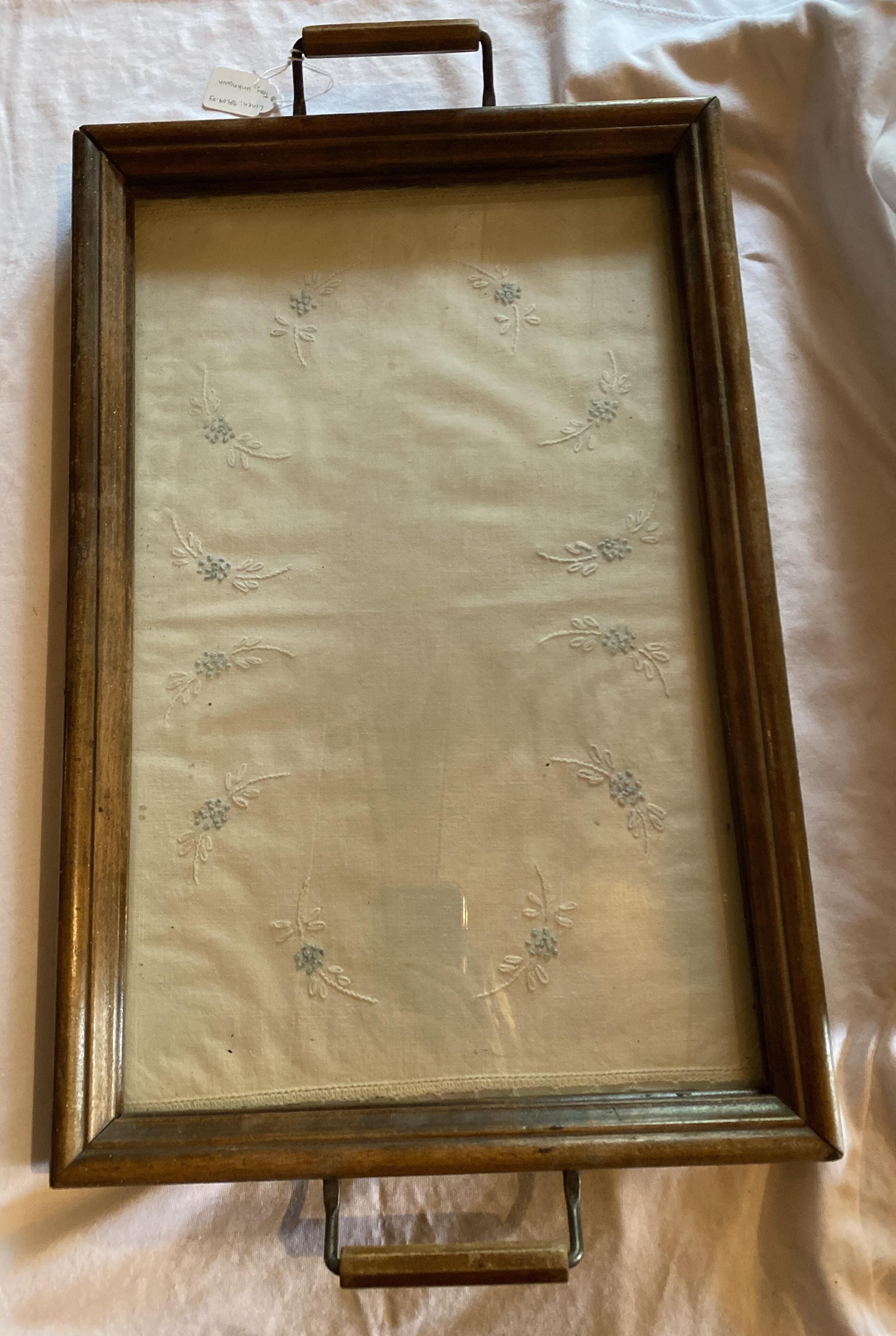 Linen cloth - in tray, under glass, tray is not listed in donation record so unsure if tray is from seperate donation. tray nailed shutAcquisition