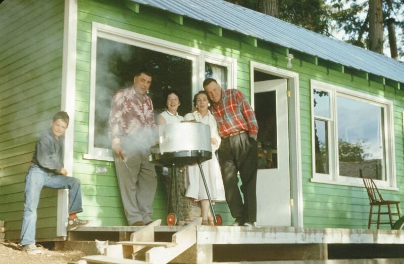 Cecil and Winnie Blakeburn and Mary and Dudley Little at the Little Cabin at Lakelse Lake 1957-59