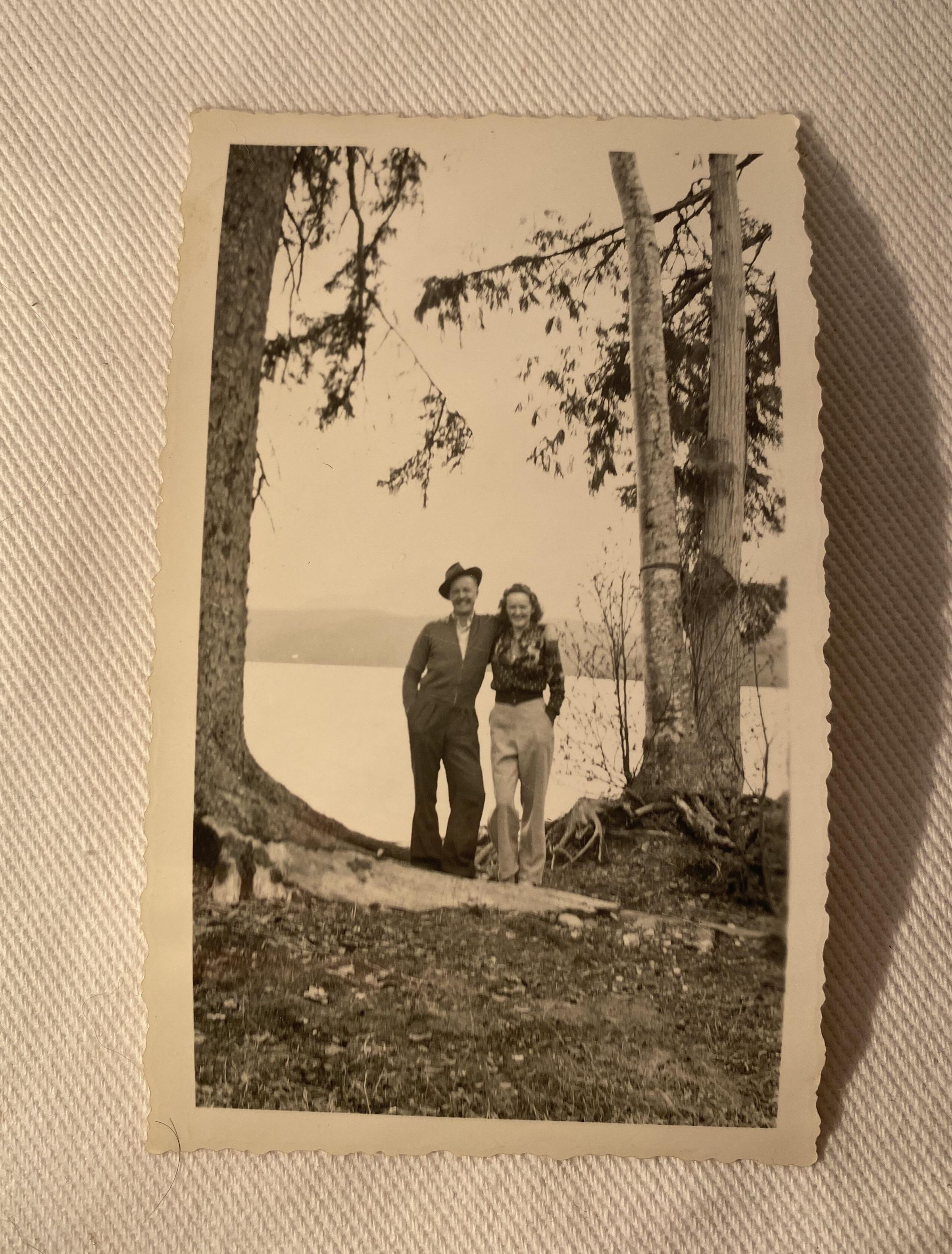 Black and white photograph of a couple in front of a lake. Back says 'Lloyd and Lorraine Johnstone'Photograph Details