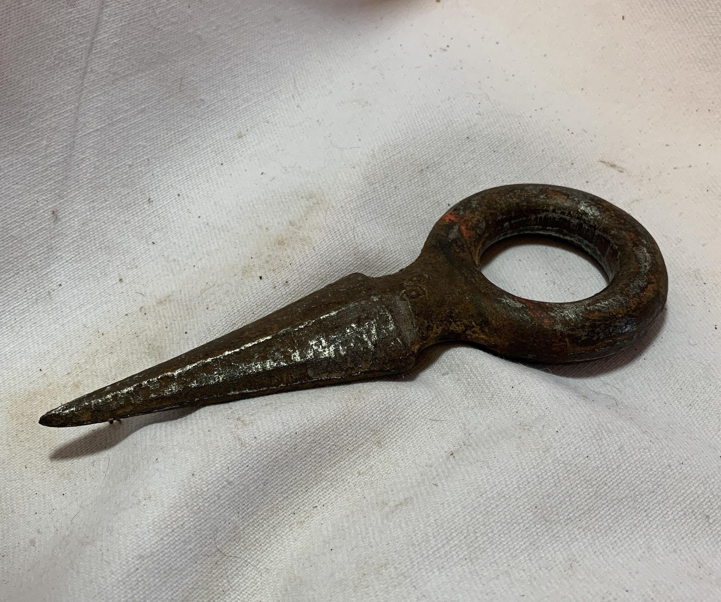 Dog used for towing logs. Metal elongted spear end attatched to thick metal ring.Acquisition