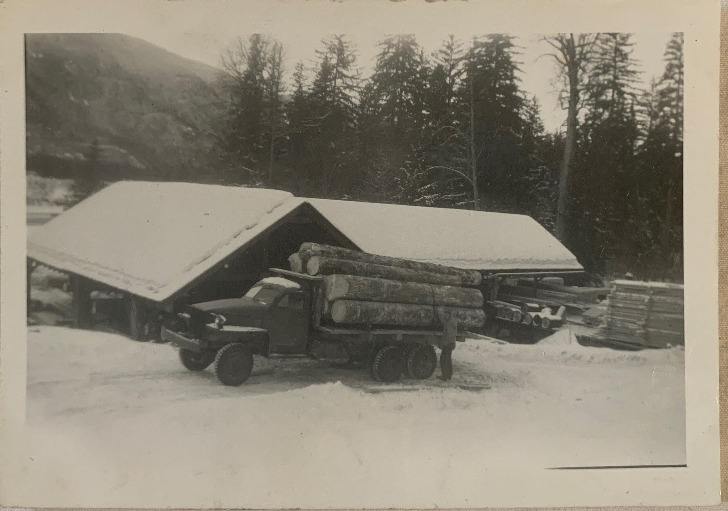 truck with logs in front of building in winterAcquisition