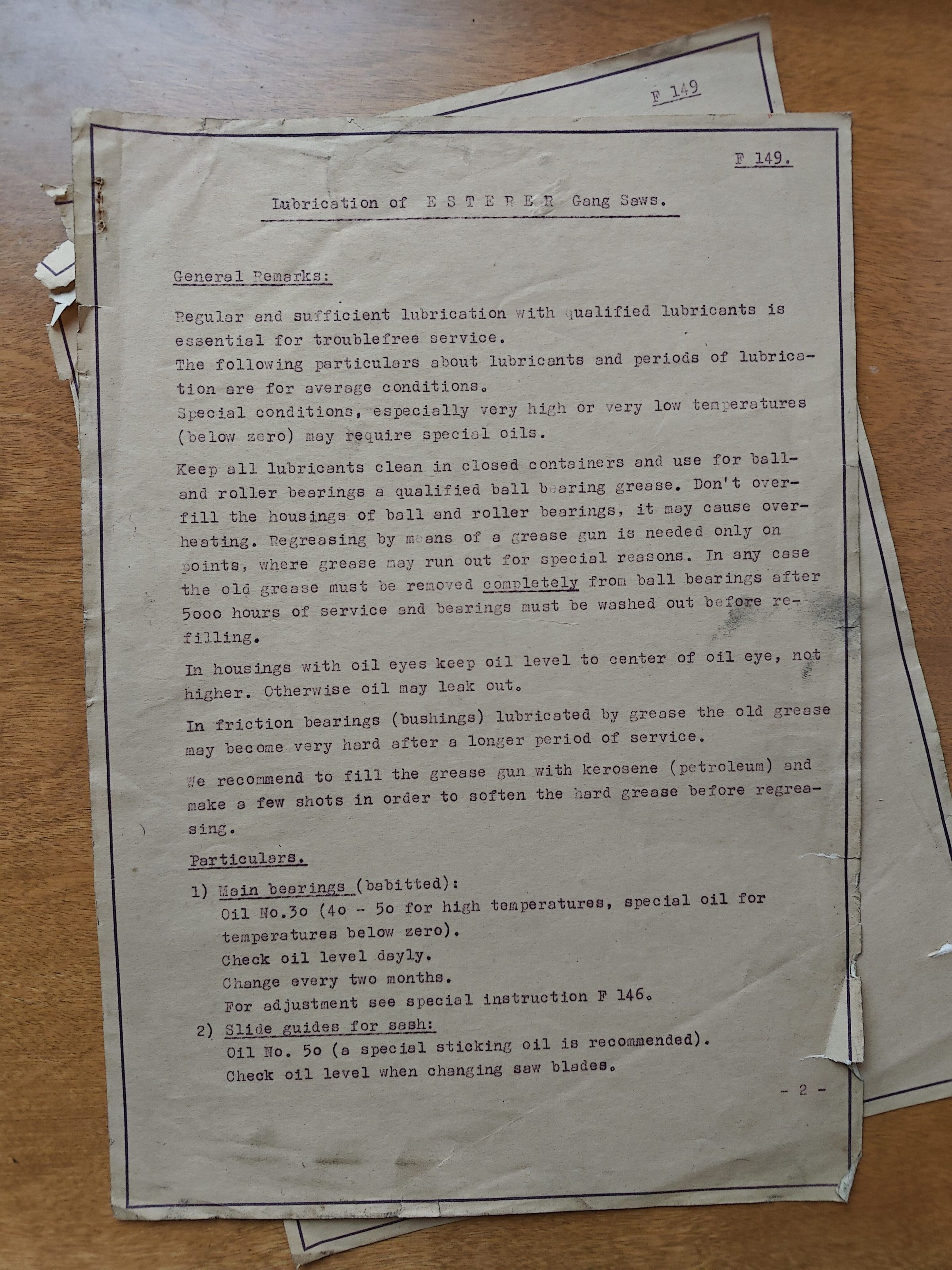 Instructions for gang saw maintenance. 2 pages in an envelope.Cataloged By