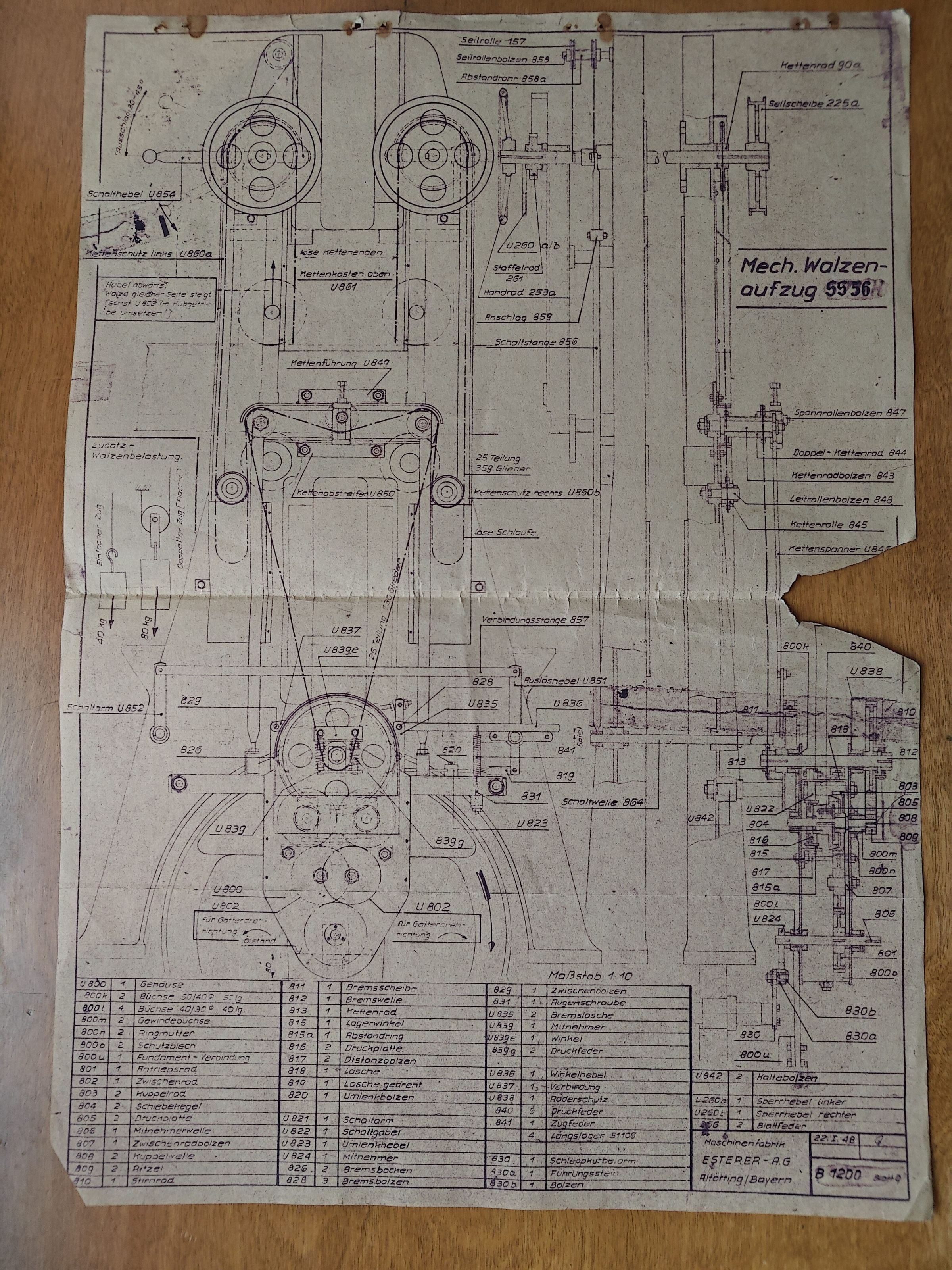 Diagram of a machine. Parts are labeled in German. "Mech. Walzen-aufzug SS56" ESTERER-A.G. B1200".Cataloged By