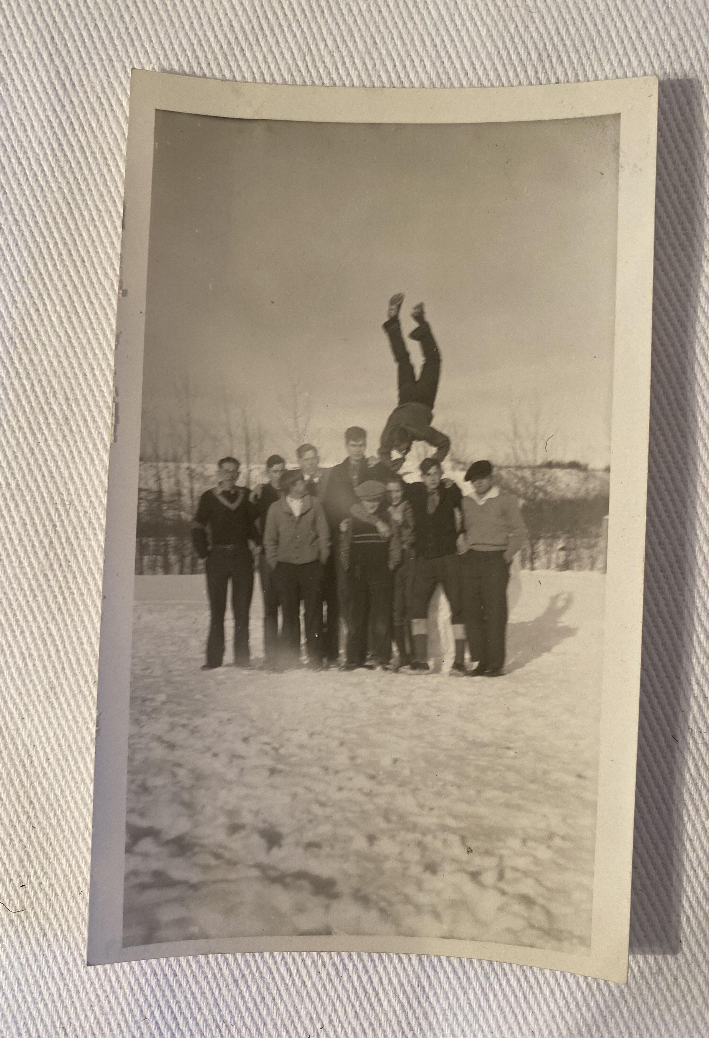 Black and white photograph of a group of young boys with a giant ball of snow. one boy is in a handstand like pose on the snowball, this is a sequel picture to 2020.19.38 It is winter and snow is on the groundCollection