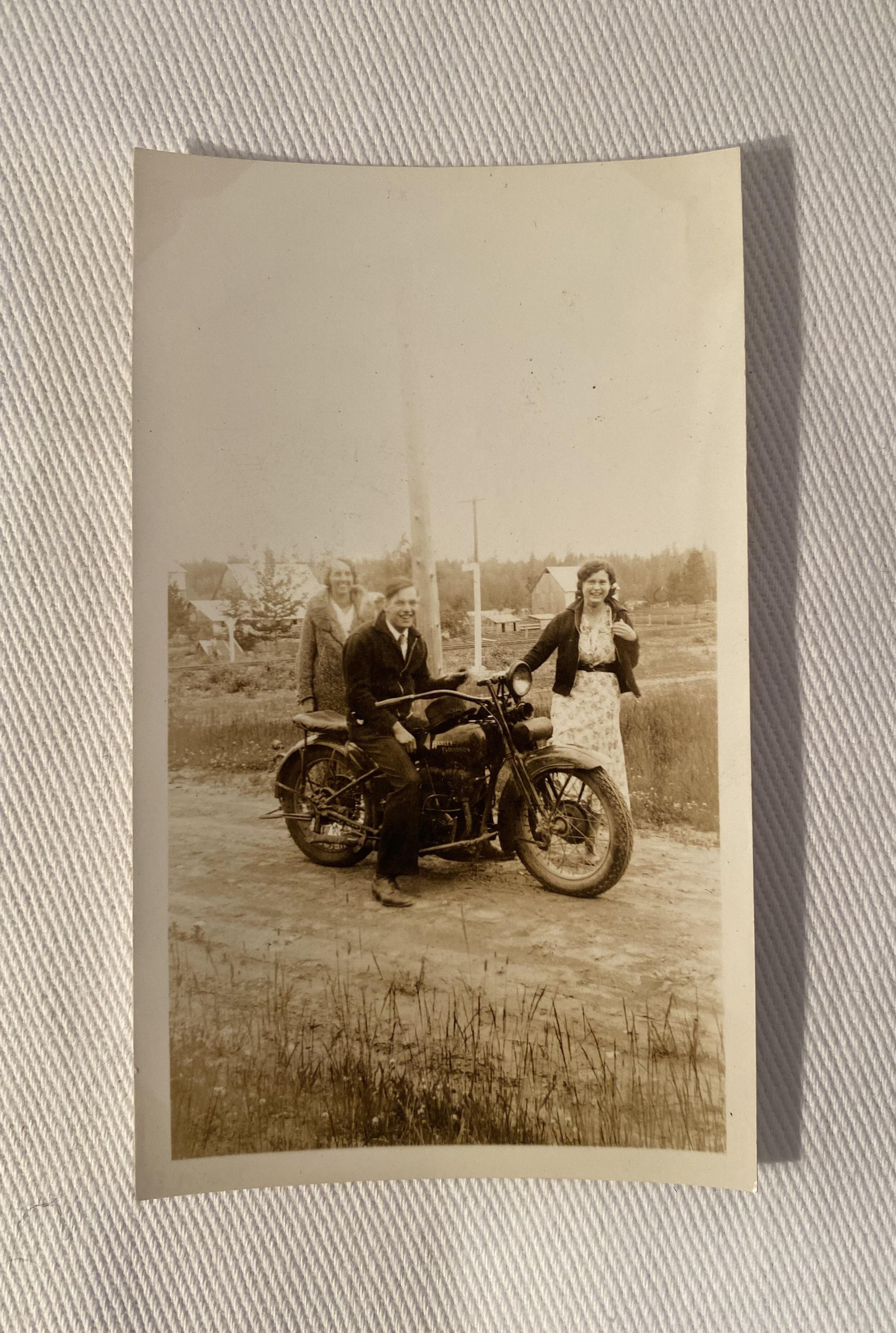 Black and white photograph with sepia tint of two women and a man sitting on a motorcycleCollection