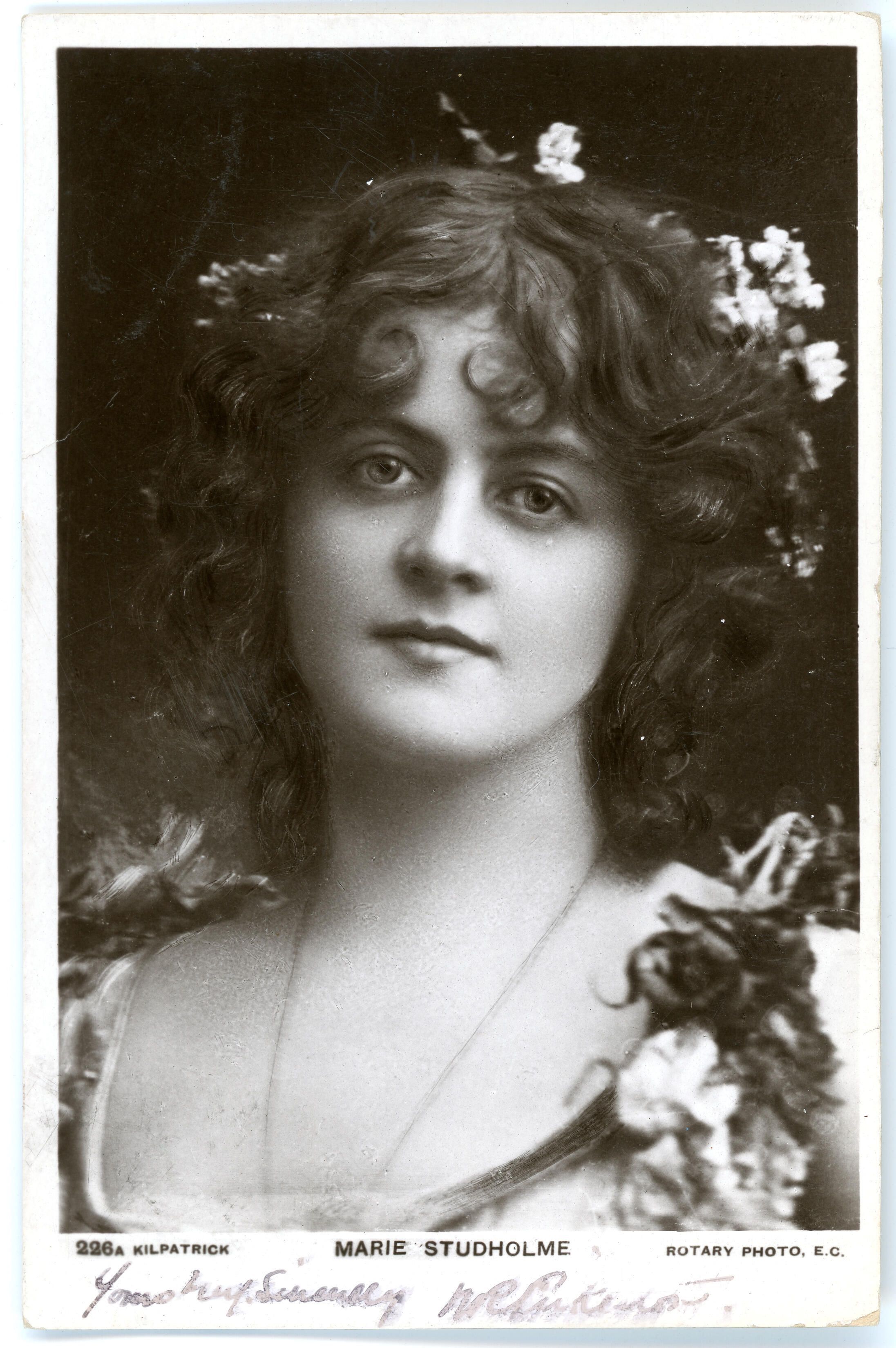 Postcard from 1904 of Marie Studholme, she is wearing a flower crownCollection