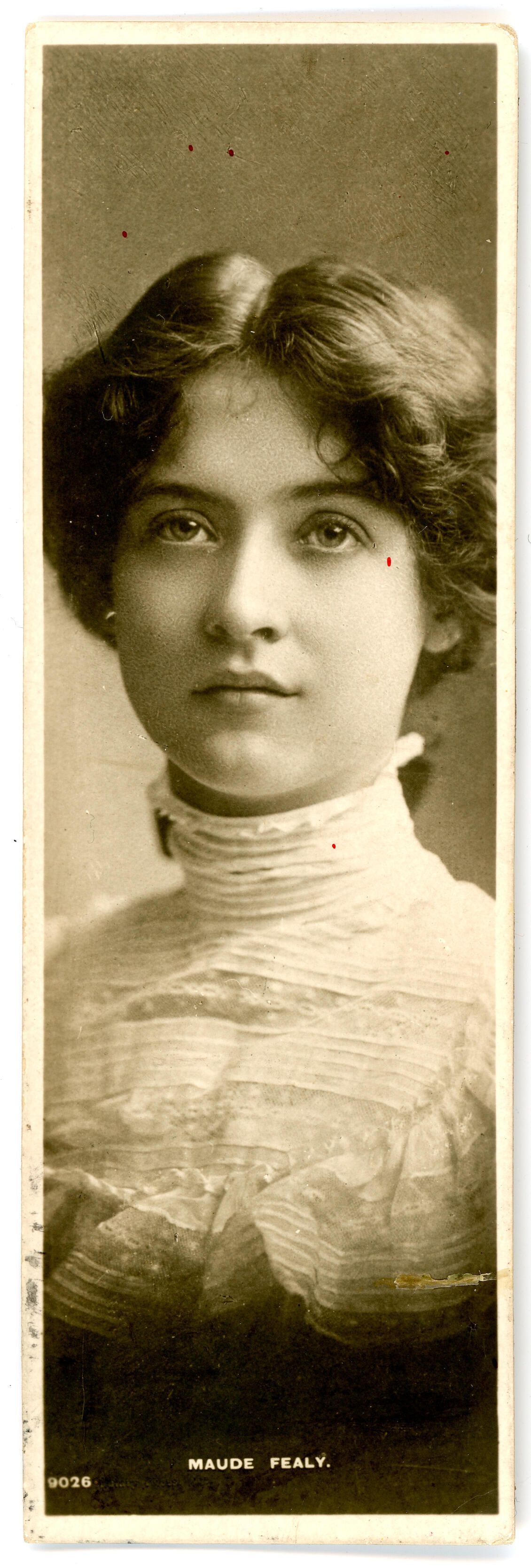 Postcard shaped to be a bookmark from 1903, the photo on the postcard is of Maude FealyCollection