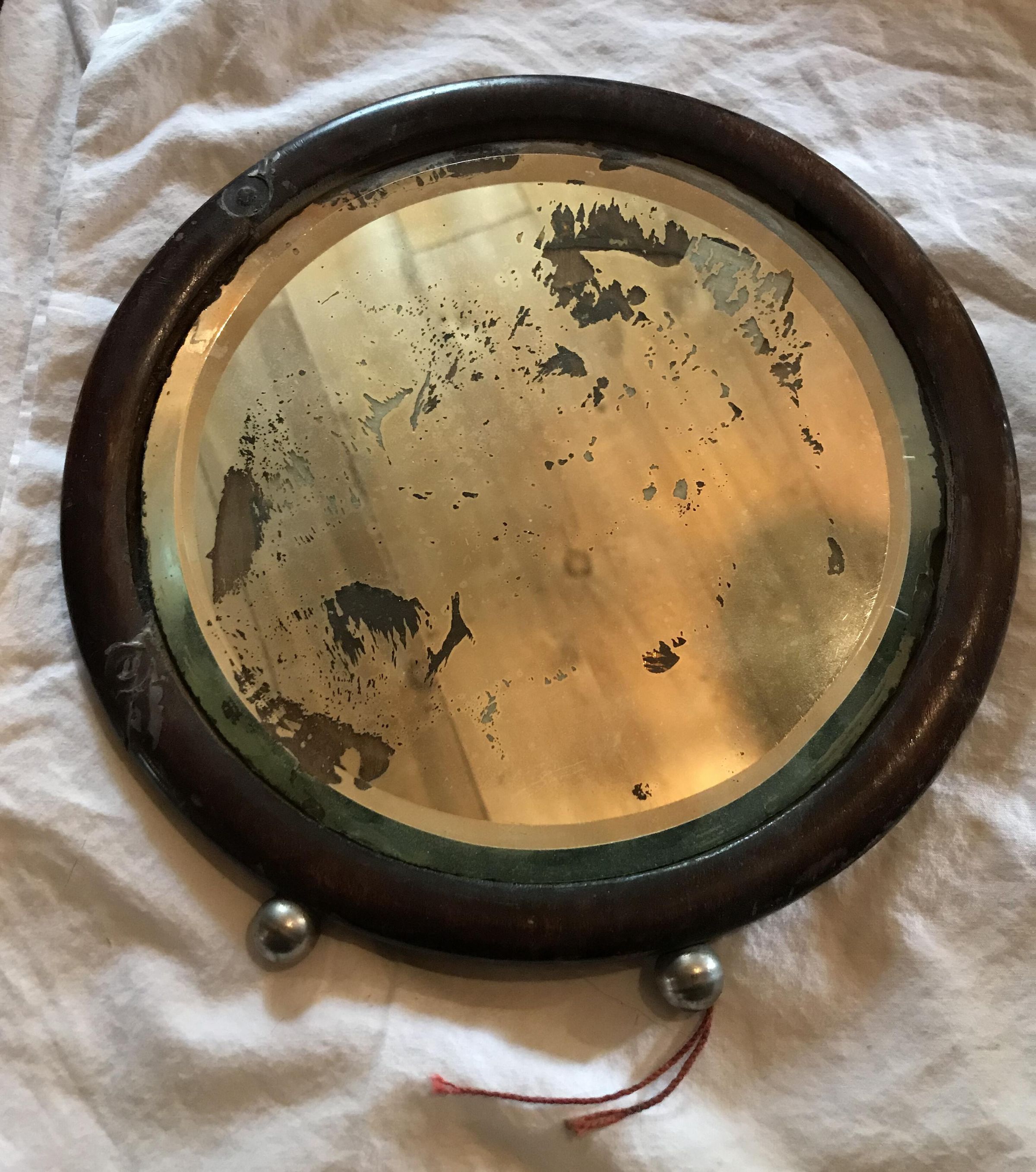 circular dresser top mirror with attatched stand. Frame made of wood.Acquisition