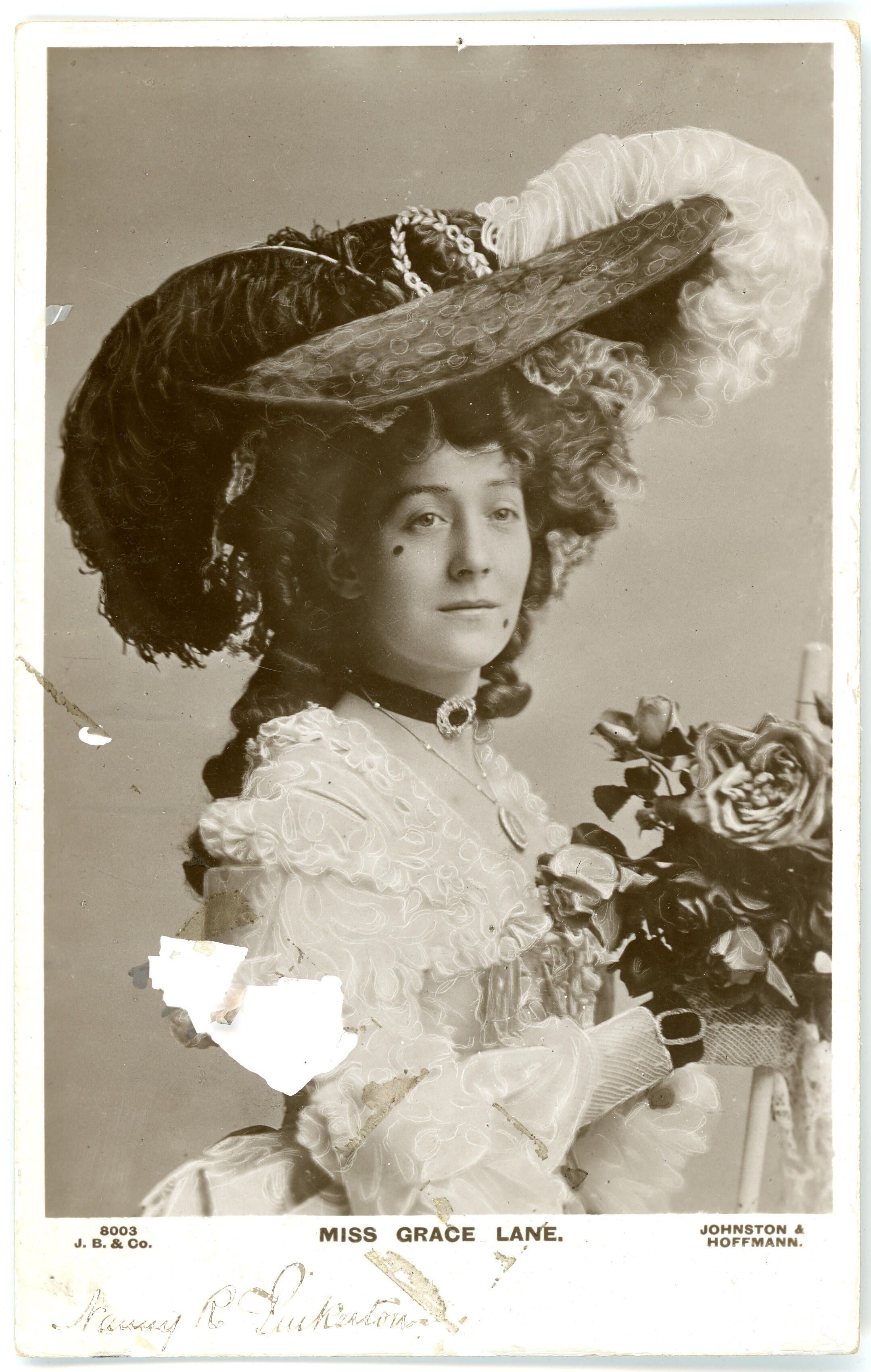 Postcard from 1904 of Grace Lane holding flowers and wearing a large feathered hatCollection