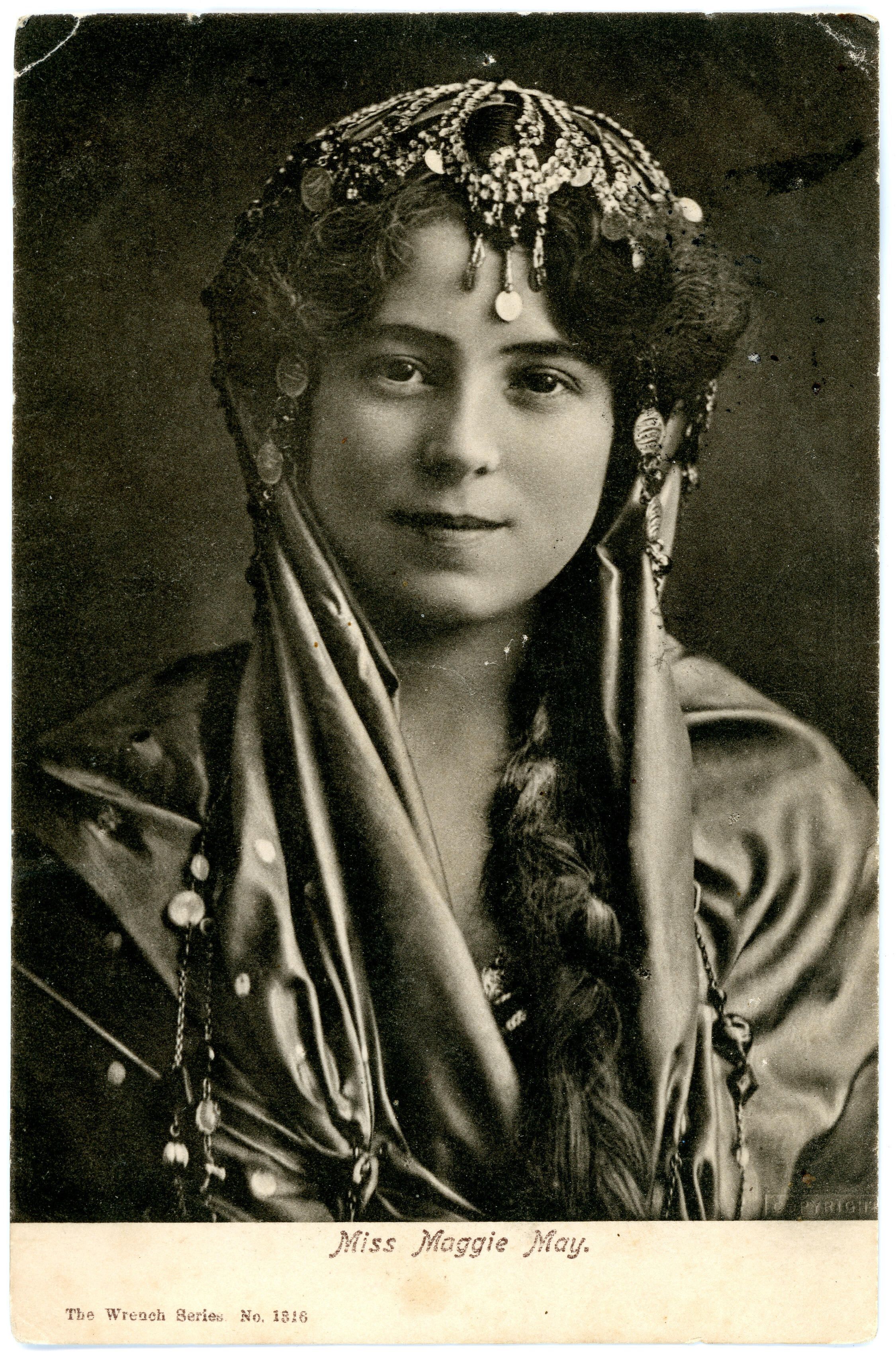Postcard from 1903 of Miss Maggie May, who is dressed in silks with a jeweled headpieceCollection