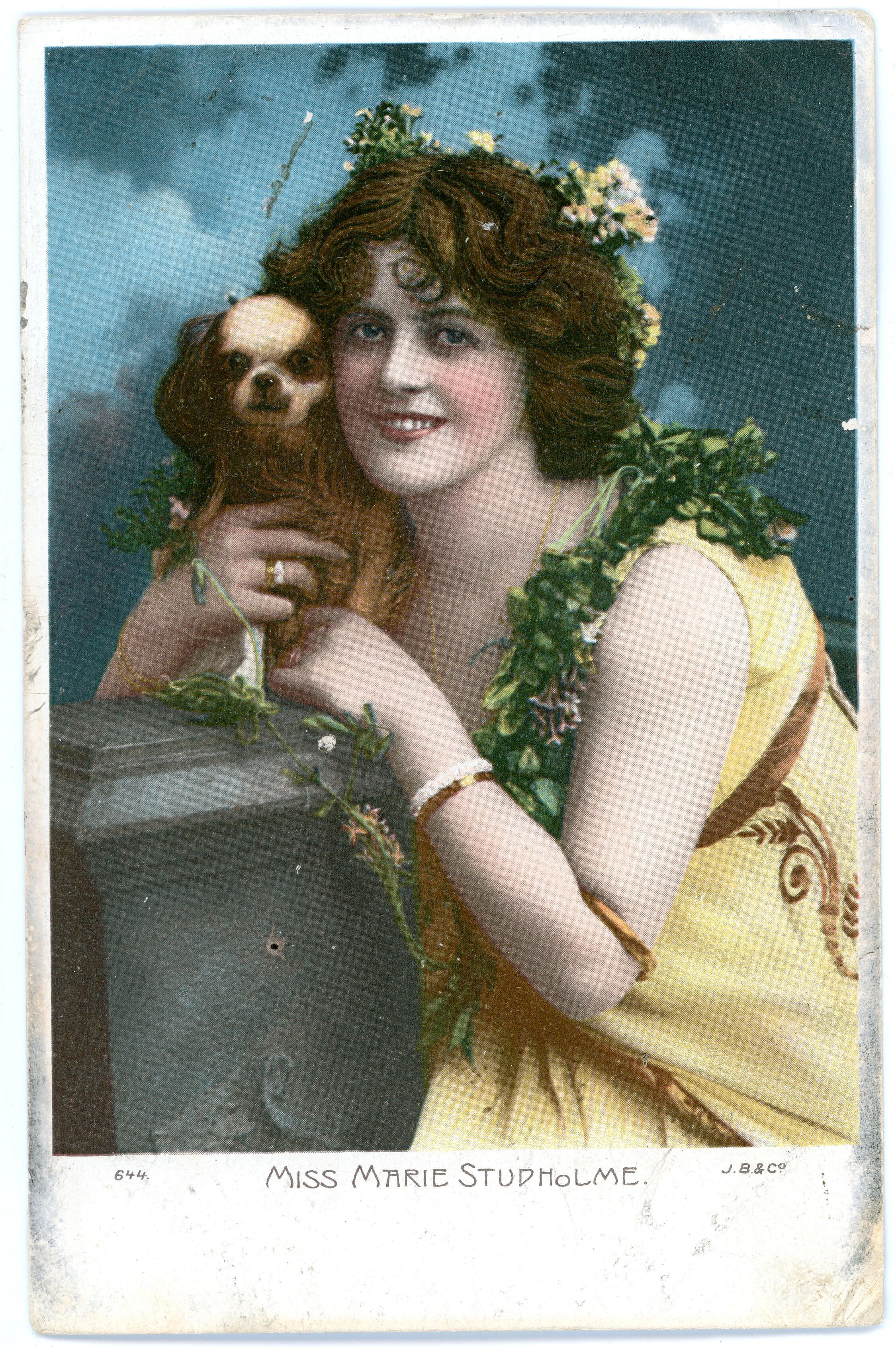 Postcard from 1904 of Miss Marie Studholmn, holding a young puppyCollection