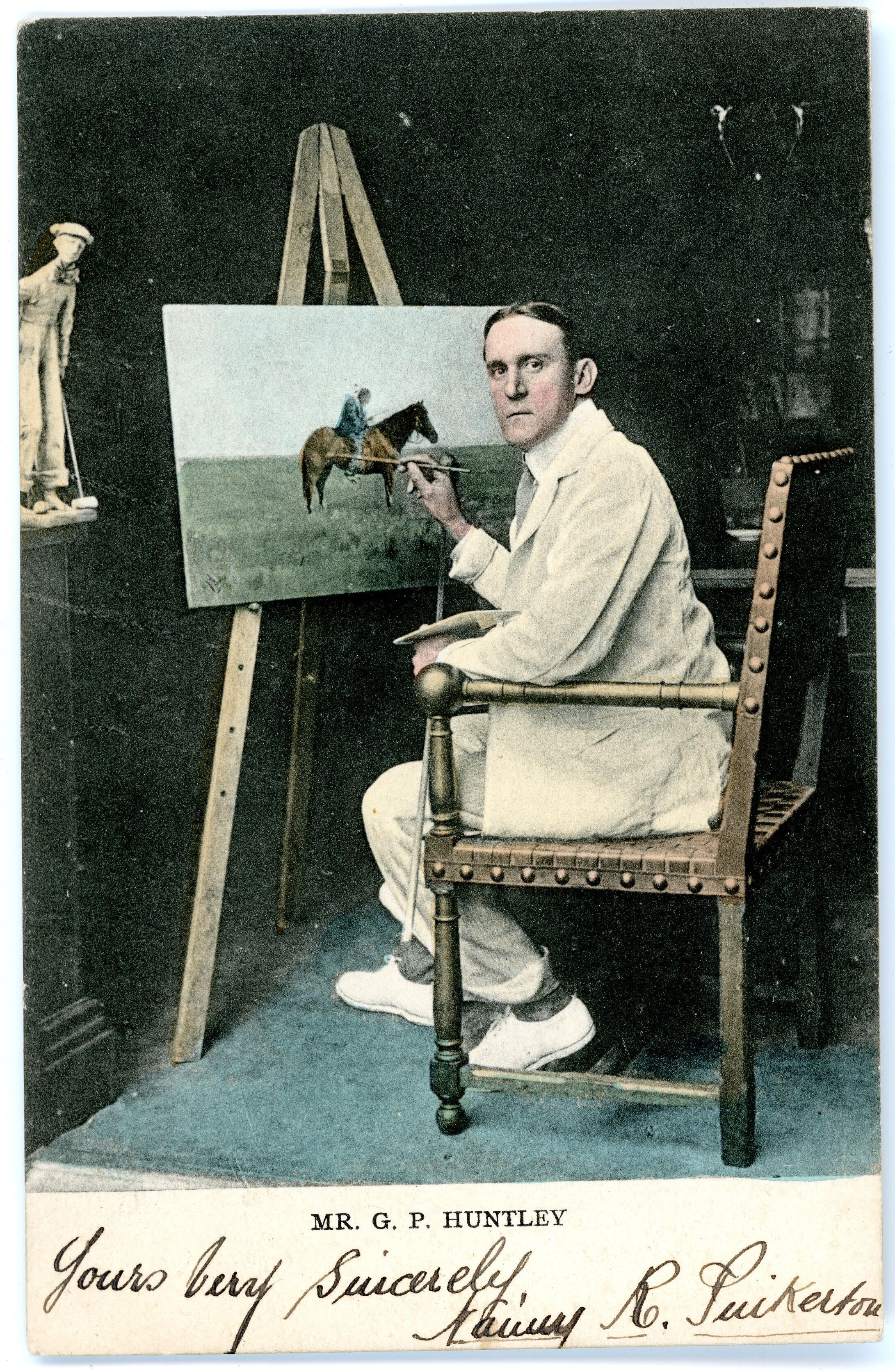Postcard from 1903 of Mr G.P. Huntley painting a picture of a horseCollection